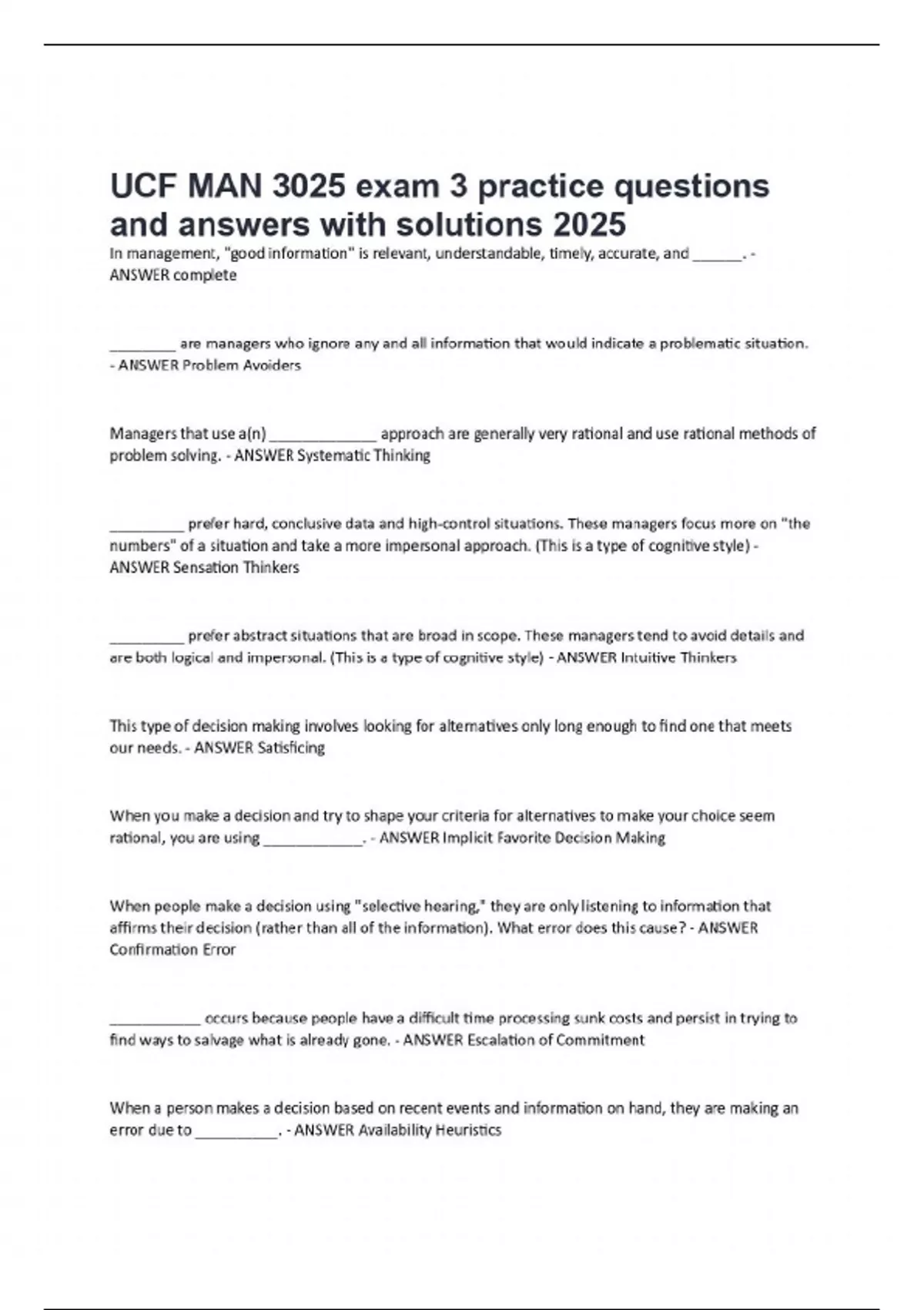 UCF MAN 3025 exam 3 practice questions and answers with solutions 2025