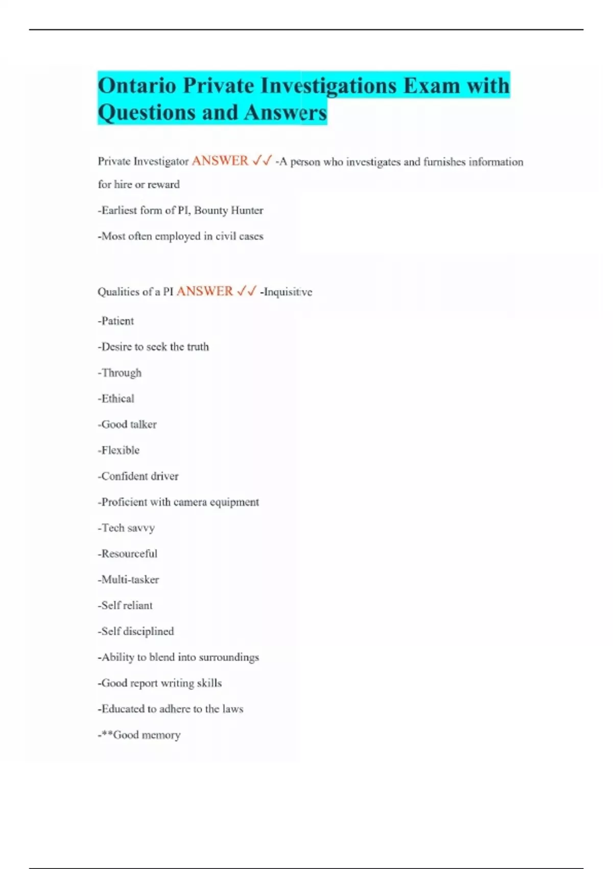 Ontario Private Investigations Exam with Questions and Answers Private Investigator ANSWER -A person who investigates and furnishes information for hire or reward -Earliest form of PI, Bounty Hunter -Most often employed in civil cases Qualities of a PI ANSWER -Inquisitive -Patient -Desire to seek the truth -Through -Ethical -Good talker -Flexible -Confident driver -Proficient with camera equipment -Tech savvy -Resourceful -Multi-tasker -Self reliant -Self disciplined -Ability to blend into surroundings -Good report writing skills -Educated to adhere to the laws -**Good memory