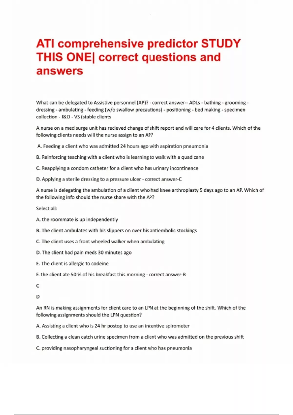 ATI comprehensive predictor STUDY THIS ONE| correct questions and answersATI comprehensive predictor STUDY THIS ONE| correct questions and answers What can be delegated to Assistive personnel (AP)? - correct answer-- ADLs - bathing - grooming - dressing - ambulating - feeding (w/o swallow precautions) - positioning - bed making - specimen collection - I&O - VS (stable clients A nurse on a med surge unit has recieved change of shift report and will care for 4 clients. Which of the following clients needs will the nurse assign to an AP? A. Feeding a client who was admitted 24 hours ago with aspiration pneumonia B. Reinforcing teaching with a client who is learning to walk with a quad cane C. Reapplying a condom catheter for a client who has urinary incontinence D. Applying a sterile dressing to a pressure ulcer - correct answer-C A nurse is delegating the ambulation of a client who had knee arthroplasty 5 days ago to an AP. Which of the following info should the nurse share with the AP? Select all: A. the roommate is up independently B. The client ambulates with his slippers on over his antiembolic stockings C. The client uses a front wheeled walker when ambulating D. The client had pain meds 30 minutes ago E. The client is allergic to codeine F. the client ate 50 % of his breakfast this morning - correct answer-B C D An RN is making assignments for client care to an LPN at the beginning of the shift. Which of the following assignments should the LPN question? A. Assisting a client who is 24 hr postop to use an incentive spirometer B. Collecting a clean catch urine specimen from a client who was admitted on the previous shift C. providing nasopharyngeal suctioning for a client who has pneumonia D. Replacing the cartridge and tubing on a PCA pump - correct answer-D A nurse is preparing an inservice program about delegation. Which of the following elements should she identify when presenting the 5 rights of delegation. Select all: A. Right client B. Right supervision/evaluation C. Right direction/communication D. Right time E. Right circumstances - correct answer-B C E A nurse manager of a med surge unit is assigning care responsibilities for the oncoming shift. A client is waiting transfer back to the unit from the PACU following thoracic surgery. To which staff member should the nurse assign the client? A. Charge nurse B. RN C. LVN D. AP - correct answer-B What is the study of conduct and character? - correct answer-Ethics What are the values and beliefs that guide behavior and decision making? - correct answer-Morals What is the right to make ones own personal decisions, even tho those decisions might not be in the persons best interest - correct answer-Autonomy What are positive actions to help others - correct answer-Beneficience What is an agreement to keep promises - correct answer-Fidelity What is fairness in care delivery and use of resources - correct answer-Justice What is avoidance of harm or injury - correct answer-Non-maleficence A nurse is caring for a client who decides not to have surgery despite significant blockages in his coronary arteries. The nurse understands that this clients choice is an example of what principles? A. Fidelity B. Autonomy C. Justice D. Nonmalificience - correct answer-A A nurse offers pain meds to a client who is postop prior to ambulation. The nurse understands that this aspect of care delivery is an example of which of the following ethical principles? A. Fidelity B. Autonomy C. Justice D. Beneficience - correct answer-D A nurse is instructing a group of nursing students about the responsibilities involved with organ donation and procurement. When the nurse explains that all clients waiting for a kidney transplant have to meet the same qualifications, the students should understand that this aspect of care delivery is an example of which ethical principle A. Fidelity B. Autonomy C. Justice D. Nonmaleficence - correct answer-C A nurse questions a med prescription as too extreme and light of the clients advanced age and unstable status. The nurse understands that this action is an example of which ethical principle A. Fidelity B. Autonomy C. Justice D. Nonmalificence - correct answer-D Which of the following situations can be identified as an ethical dilemma? A. A nurse on a med surge unit demonstrates signs of chemical impairment B. A nurse over hears another nurse telling an older adult client that if he doesnt stay in bed she will restrain him C. A family has conflicting feelings about the initiation of enteral tube feedings of their father who is terminally ill D. A client who is terminally ill hesitates to name her spouse on her durable power of attorney form - correct answer-C Most managers can be categorized as - correct answer-authoritative, democratic, and laissez faire makes decisions of the group motivates by coercion communication occurs down the chain of command Work output by the staff is usually high-good for crisis situations and bureaucratic settings - correct answer-Authoritative includes the group when decisions are made Motivates by supporting star achievements Communication occurs up and down the chain of command Work output by staff is usually of good quality-good when cooperation and collaboration is necessary - correct answer-Democratic makes very few decisions and does little planning motivation is largely the responsibility of individuals staff members Communication occurs up and down the chain of command and between group members Work output is low unless an informal leader evolves from the group *the use of any of these styles may be appropriate depending on the situation - correct answer-Laissez faire The nurse should consider the hierarchy of human needs when prioritizing interventions, which are? - correct answer-- Physiological needs first (oxygen, shelter, food) - Safety & security needs (physical safety) - Love and belonging - Self esteem - Self actualization The ABC framework identifies, in order, the three basic ne