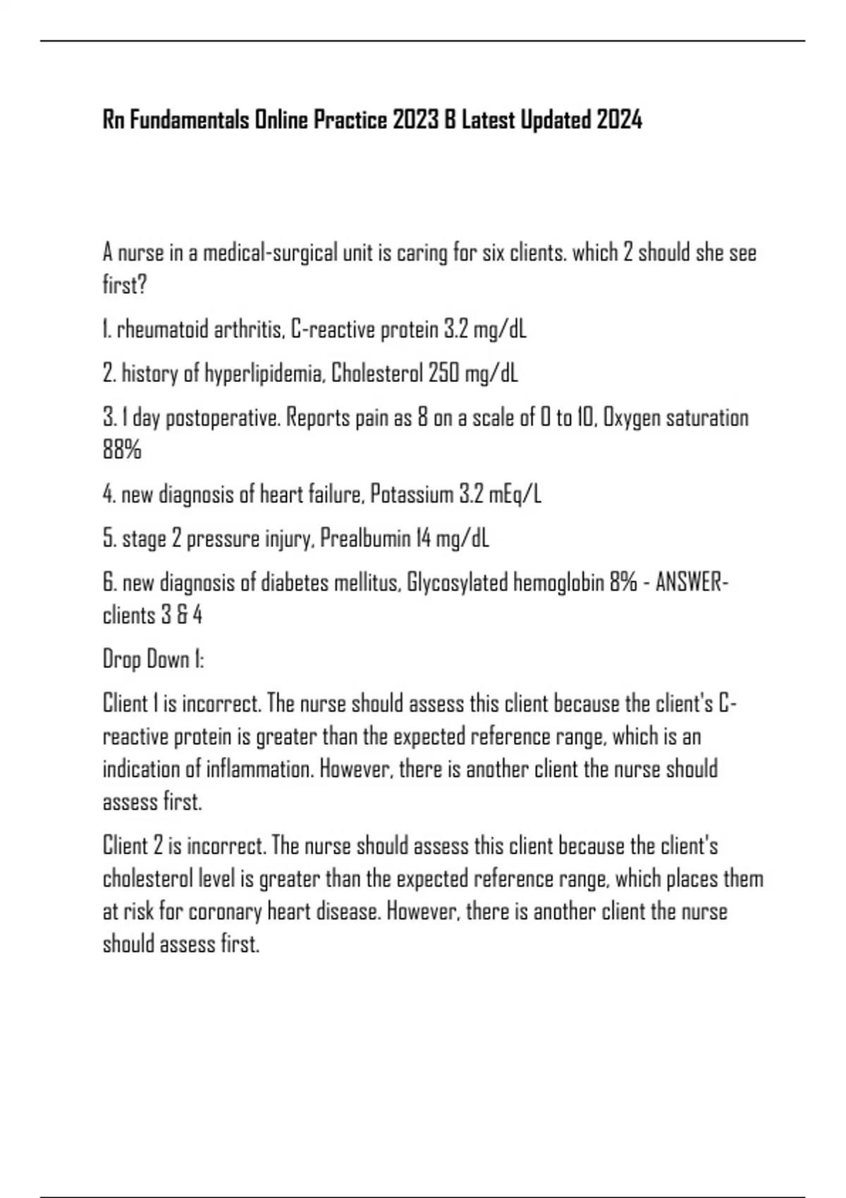 Rn Fundamentals Online Practice 2023 B Latest Updated 2024 A nurse in a medical-surgical unit is caring for six clients. which 2 should she see first? 1. rheumatoid arthritis, C-reactive protein 3.2 mg/dL 2. history of hyperlipidemia, Cholesterol 250 mg/dL 3. 1 day postoperative. Reports pain as 8 on a scale of 0 to 10, Oxygen saturation 88% 4. new diagnosis of heart failure, Potassium 3.2 mEq/L 5. stage 2 pressure injury, Prealbumin 14 mg/dL 6. new diagnosis of diabetes mellitus, Glycosylated hemoglobin 8% - ANSWERclients 3 & 4 Drop Down 1: Client 1 is incorrect. The nurse should assess this client because the client's Creactive protein is greater than the expected reference range, which is an indication of inflammation. However, there is another client the nurse should assess first. Client 2 is incorrect. The nurse should assess this client because the client's cholesterol level is greater than the expected reference range, which places them at risk for coronary heart disease. However, there is another client the nurse should assess first. Client 3 is correct. When using the airway, breathing, circulation approach to client care, the nurse should determine that this client is the priority client to assess. The client has an oxygen saturation that is less than the expected reference range, which is an indication of hypoxia. Drop Down 2: Client 4 is correct. When using the airway, breathing, circulation approach to client care, the nurse should determine that this client is the next priority client to assess. The client has a potassium level that is less than the expected reference range, which places the client at risk for dysrhythmias. Client 5 is incorrect. The nurse should assess this client because their prealbumin level is less than the expected reference range, which places them at risk for delayed wound healing. However, this client is not the next priority client to assess. Client 6 is incorrect. The nurse should assess this client because their glycosylated hemoglobin level is greater than the expected reference range, which indicates poor diabetic control. However, this client is not the next priority client to assess. A nurse is caring for a client who has a peripheral IV inserted for fluid replacement. Nurses' Notes Day 1: Lactated Ringer's at 100 mL/hr infusing into a 20-gauge IV catheter in left hand. IV dressing dry and intact. IV site without redness or swelling. IV fluid infusing well. Day 2: