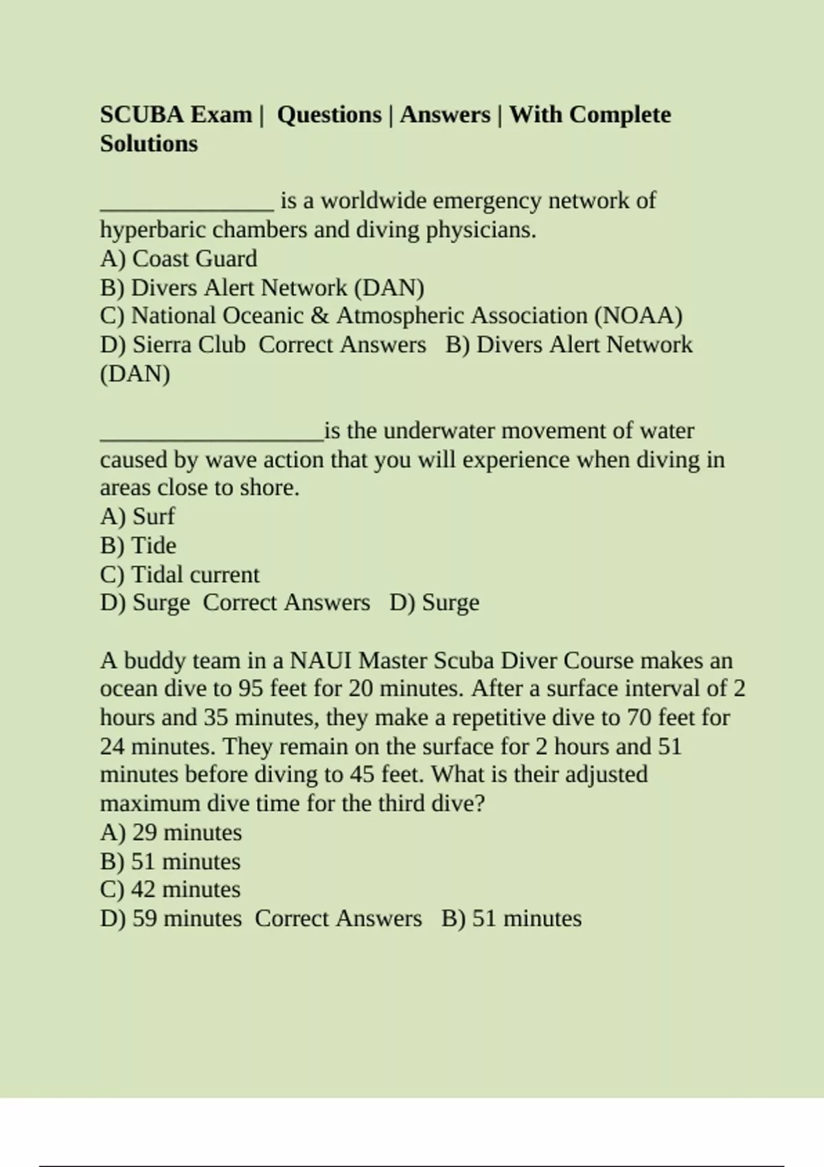 SCUBA Exam | Questions | Answers | With Complete Solutions