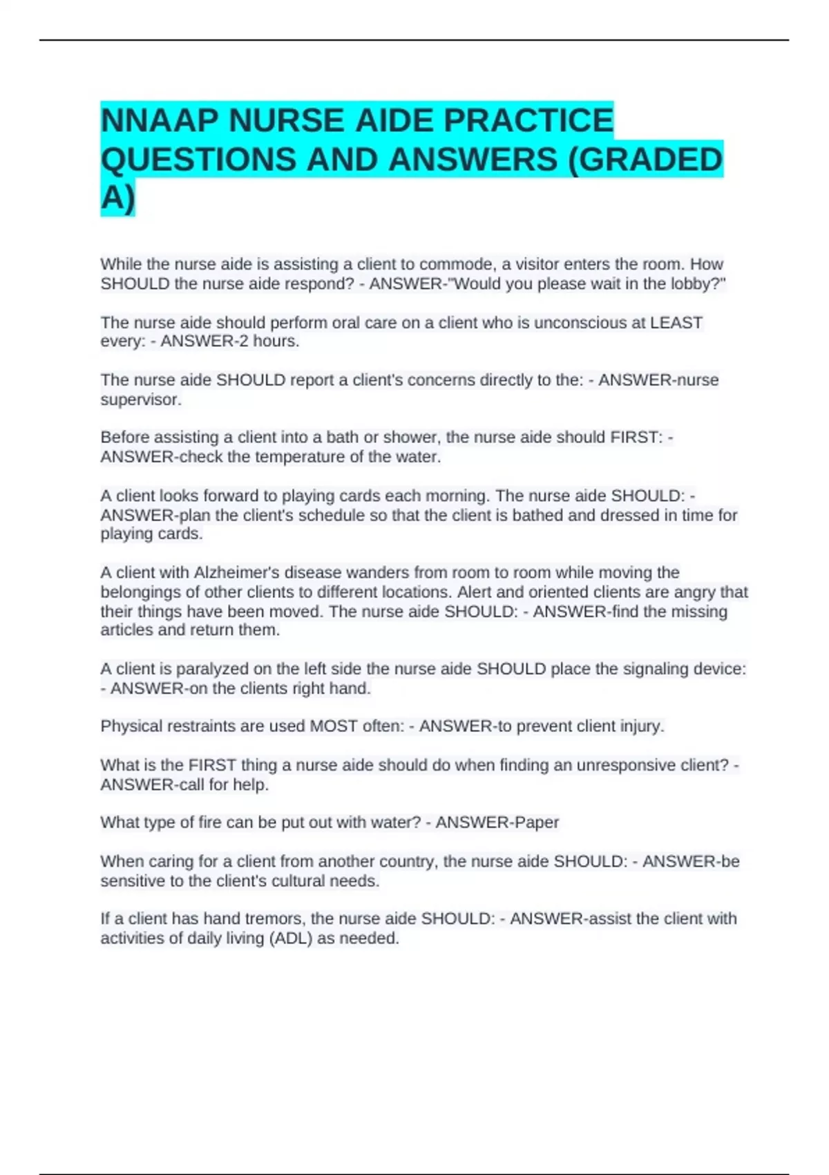 NNAAP NURSE AIDE PRACTICE QUESTIONS AND ANSWERS (GRADED A)NNAAP NURSE AIDE PRACTICE QUESTIONS AND ANSWERS (GRADED A)NNAAP NURSE AIDE PRACTICE QUESTIONS AND ANSWERS (GRADED A) While the nurse aide is assisting a client to commode, a visitor enters the room. How SHOULD the nurse aide respond? - ANSWER-"Would you please wait in the lobby?" The nurse aide should perform oral care on a client who is unconscious at LEAST every: - ANSWER-2 hours. The nurse aide SHOULD report a client's concerns directly to the: - ANSWER-nurse supervisor. Before assisting a client into a bath or shower, the nurse aide should FIRST: - ANSWER-check the temperature of the water.