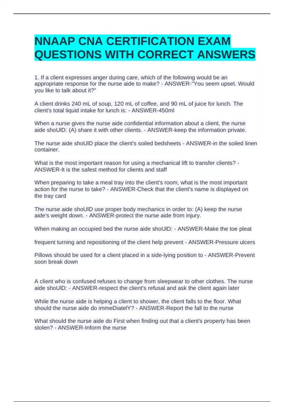 NNAAP CNA CERTIFICATION EXAM QUESTIONS WITH CORRECT ANSWERSNNAAP CNA CERTIFICATION EXAM QUESTIONS WITH CORRECT ANSWERSNNAAP CNA CERTIFICATION EXAM QUESTIONS WITH CORRECT ANSWERS 1. If a client expresses anger during care, which of the following would be an appropriate response for the nurse aide to make? - ANSWER-"You seem upset. Would you like to talk about it?" A client drinks 240 mL of soup, 120 mL of coffee, and 90 mL of juice for lunch. The client's total liquid intake for lunch is: - ANSWER-450ml When a nurse gives the nurse aide confidential information about a client, the nurse aide shoUlD: (A) share it with other clients. - ANSWER-keep the information private. The nurse aide shoUlD place the client's soiled bedsheets - ANSWER-in the soiled linen container.