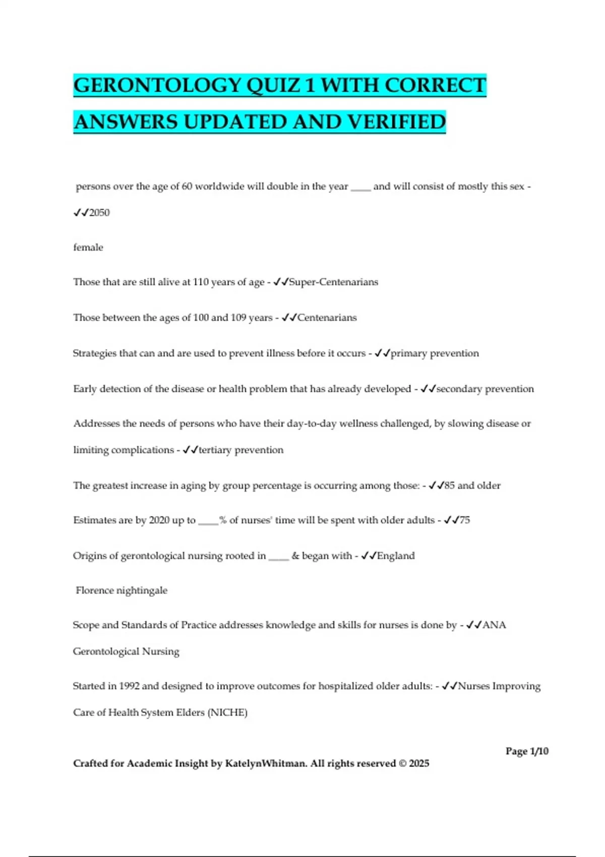 GERONTOLOGY QUIZ 1 WITH CORRECT ANSWERS UPDATED AND VERIFIED persons over the age of 60 worldwide will double in the year ____ and will consist of mostly this sex - 2050 female Those that are still alive at 110 years of age - Super-Centenarians Those between the ages of 100 and 109 years - Centenarians Strategies that can and are used to prevent illness before it occurs - primary prevention Early detection of the disease or health problem that has already developed - secondary prevention Addresses the needs of persons who have their day-to-day wellness challenged, by slowing disease or limiting complications - tertiary prevention The greatest increase in aging by group percentage is occurring among those: - 85 and older Estimates are by 2020 up to ____% of nurses' time will be spent with older adults - 75 Origins of gerontological nursing rooted in ____ & began with - England Florence nightingale Scope and Standards of Practice addresses knowledge and skills for nurses is done by - ANA Gerontological Nursing Started in 1992 and designed to improve outcomes for hospitalized older adults: - Nurses Improving Care of Health System Elders (NICHE) Page 2/10 Crafted for Academic Insight by KatelynWhitman. All rights reserved © 2025 One in _____ older adults is readmitted to the hospital within 30 days of leaving - five 1 out of ___ Medicare patients admitted to a skilled nursing facility will be readmitted within 30 days - 4 _____ are the most prevalent adverse event following discharge from the hospital - Medication discrepancies Which was the first formal action the ANA took in relation to gerontological nursing? - Established a national geriatric nursing group Which gerontological organization had a significant influence on the care of older adults? - john Hartford foundation Biological aging— aka "____" - senescence A complex genetically regulated interactive process of change in every living organism - Biological aging—"senescence Changes to cells that decrease ability to replicate attributed to aging, especially the mitochondria - - cellular functioning What biological theory? Cellular replication is critical to survival, integrity of genetic code implies new cells have same form and fx of old ones, organisms are destined to become more complex over time - - cellular function and aging What biological theory? Cells have limited replication, aging is result of predictable cellular death, cells and organisms have predetermined life span known as haflick limit or biological clock, - Programmed aging theory Page 3/10 Crafted for Academic Insight by KatelynWhitman. All rights reserved © 2025 What biological theory? Changes at the cellular level are random and unpredidcatble Wear and tear, oxidative stress, free radical, mutations, telomeres and aging - ERROR THEORIES What biological theory? Cellular errors a result of "wearing out" over time from continued use Associated with internal and external stressors (associated with free radicals) Causes a progressive decline in cellular function or increased cellular death - WEAR AND TEAR THEORY Increased ROS reactive oxygen species is referred to as "______" or "________" - oxidative stre