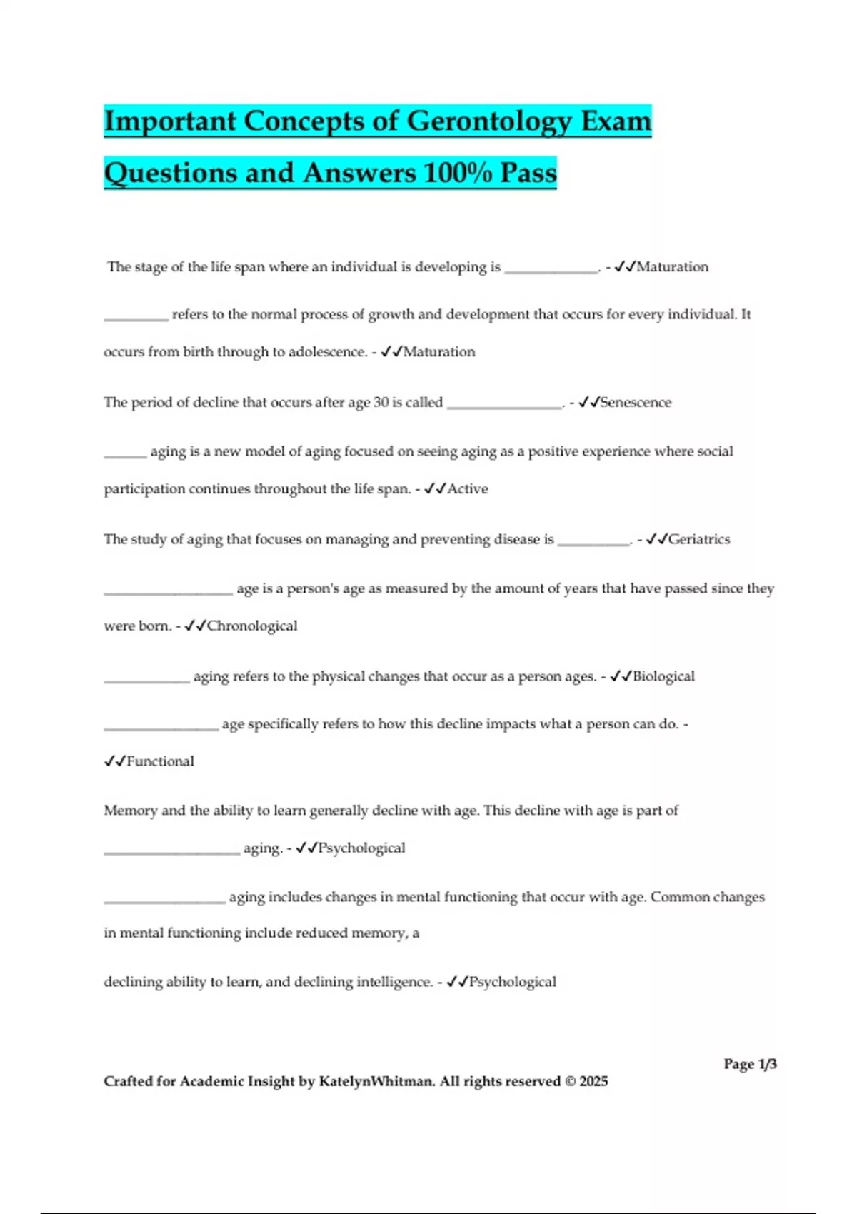 Important Concepts of Gerontology Exam Questions and Answers 100% Pass The stage of the life span where an individual is developing is _____________. - Maturation _________ refers to the normal process of growth and development that occurs for every individual. It occurs from birth through to adolescence. - Maturation The period of decline that occurs after age 30 is called ________________. - Senescence ______ aging is a new model of aging focused on seeing aging as a positive experience where social participation continues throughout the life span. - Active The study of aging that focuses on managing and preventing disease is __________. - Geriatrics __________________ age is a person's age as measured by the amount of years that have passed since they were born. - Chronological ____________ aging refers to the physical changes that occur as a person ages. - Biological ________________ age specifically refers to how this decline impacts what a person can do. - Functional Memory and the ability to learn generally decline with age. This decline with age is part of ___________________ aging. - Psychological _________________ aging includes changes in mental functioning that occur with age. Common changes in mental functioning include reduced memory, a declining ability to learn, and declining intelligence. - Psychological