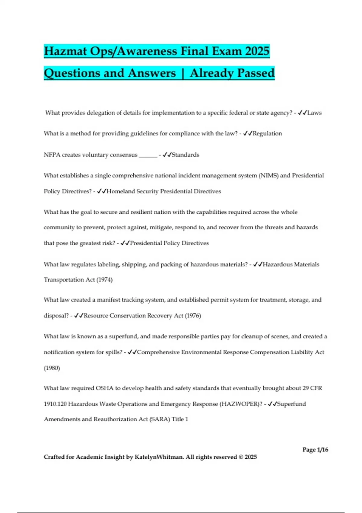 Hazmat Ops/Awareness Final Exam 2025 Questions and Answers | Already Passed What provides delegation of details for implementation to a specific federal or state agency? - Laws What is a method for providing guidelines for compliance with the law? - Regulation NFPA creates voluntary consensus ______ - Standards What establishes a single comprehensive national incident management system (NIMS) and Presidential Policy Directives? - Homeland Security Presidential Directives What has the goal to secure and resilient nation with the capabilities required across the whole community to prevent, protect against, mitigate, respond to, and recover from the threats and hazards that pose the greatest risk? - Presidential Policy Directives What law regulates labeling, shipping, and packing of hazardous materials? - Hazardous Materials Transportation Act (1974) What law created a manifest tracking system, and established permit system for treatment, storage, and disposal? - Resource Conservation Recovery Act (1976) What law is known as a superfund, and made responsible parties pay for cleanup of scenes, and created a notification system for spills? - Comprehensive Environmental Response Compensation Liability Act (1980) What law required OSHA to develop health and safety standards that eventually brought about 29 CFR 1910.120 Hazardous Waste Operations and Emergency Response (HAZWOPER)? - Superfund Amendments and Reauthorization Act (SARA) Title 1 Page 2/16 Crafted for Academic Insight by KatelynWhitman. All rights reserved © 2025 What law is also known as the emergency planning and community right to know act and created state emergency response commission and local emergency planning committees? - Superfund Amendments and Reauthorization Act (SARA) Title 3 What law requires facilities to submit an emergency and hazardous chemical inventory to SERC, LEPC, and local fire departments? - Superfund Amendments and Reauthorization Act (SARA) Title 3 What NFPA standard covers competencies for first responders dealing with Hazmat operations? - NFPA 472 What is a plan that should be consistent with local emergency response plan and within the capabilities and training level of the team, and trained on and examined and updated frequently? - Standard Operation Guideline (SOG) What is the 5 step process for hazardous materials incidents? - Isolate, Identify, Notify, Mitigate, Terminate What step in the 5 steps of hazardous materials incident do you deny access, control egress, stage incoming companies, and establish hazard zones after gathering information? - Isolate What step in the 5 steps of hazardous materials incident do you find the occupancy and location, container shapes and sizes, markings and colors, placards and labels, shipping papers/MSDS, monitoring/senses, and find the principle responsible party? - Identify What step in the 5 steps of hazardous materials incident do you get more personnel, get more equipment, and get outside agencies to come help? - Notify What step in the 5 steps of hazardous materials incident do you have non-intervention approach, offensive approach, and defensive approach? - Mitigate Page 3/16 Crafted for Academic Insight by KatelynWhitman. All rights reserved © 2025 What step in the 5 steps of hazardous materials incident do you debrief, document, do medical evaluations, recover costs, replace equipment, and critique? - Terminate In what NFPA/EPA level of response can the incident be controlled by the initial responding units? - Level 1 In what NFPA/EPA level of response there is moderate incident that encompasses a greater potential threat to the surrounding area or community? Could possibly require evacuation. - Level 2 In what NFPA/EPA level of response there is a major incident with extreme hazards over large geographic zones. These incidents typically require intervention of multiple resource agencies. - Level 3 What is a boiling liquid/expanding vapor explosion; an explosion that occurs when pressurized liquefied materials inside a closed vessel are exposed to a source of high heat? - BLEVE What is the temperature when a liquid changes its phase into a vapor or gas? - Boiling point What is the ability of a chemical to undergo an alteration in its chemical make-up,