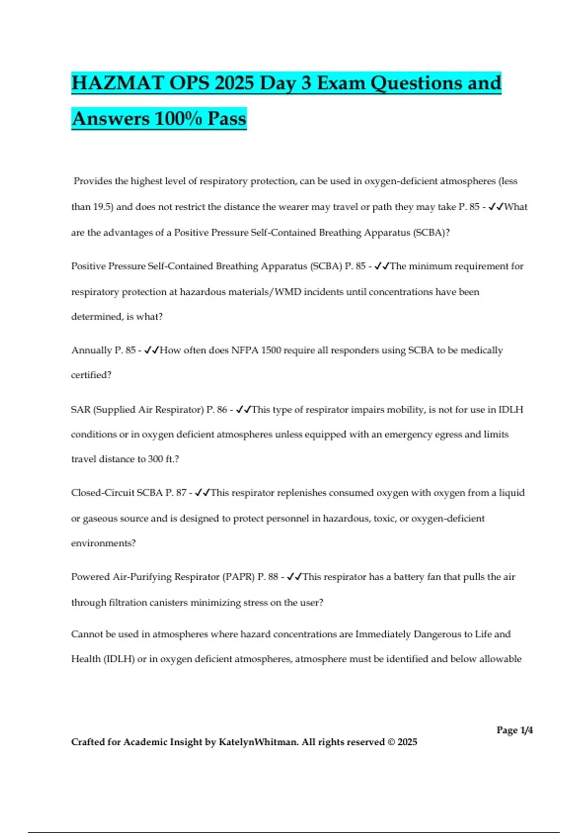 HAZMAT OPS 2025 Day 3 Exam Questions and Answers 100% Pass Provides the highest level of respiratory protection, can be used in oxygen-deficient atmospheres (less than 19.5) and does not restrict the distance the wearer may travel or path they may take P. 85 - What are the advantages of a Positive Pressure Self-Contained Breathing Apparatus (SCBA)? Positive Pressure Self-Contained Breathing Apparatus (SCBA) P. 85 - The minimum requirement for respiratory protection at hazardous materials/WMD incidents until concentrations have been determined, is what? Annually P. 85 - How often does NFPA 1500 require all responders using SCBA to be medically certified? SAR (Supplied Air Respirator) P. 86 - This type of respirator impairs mobility, is not for use in IDLH conditions or in oxygen deficient atmospheres unless equipped with an emergency egress and limits travel distance to 300 ft.? Closed-Circuit SCBA P. 87 - This respirator replenishes consumed oxygen with oxygen from a liquid or gaseous source and is designed to protect personnel in hazardous, toxic, or oxygen-deficient environments? Powered Air-Purifying Respirator (PAPR) P. 88 - This respirator has a battery fan that pulls the air through filtration canisters minimizing stress on the user? Cannot be used in atmospheres where hazard concentrations are Immediately Dangerous to Life and Health (IDLH) or in oxygen deficient atmospheres, atmosphere must be identified and below allowable