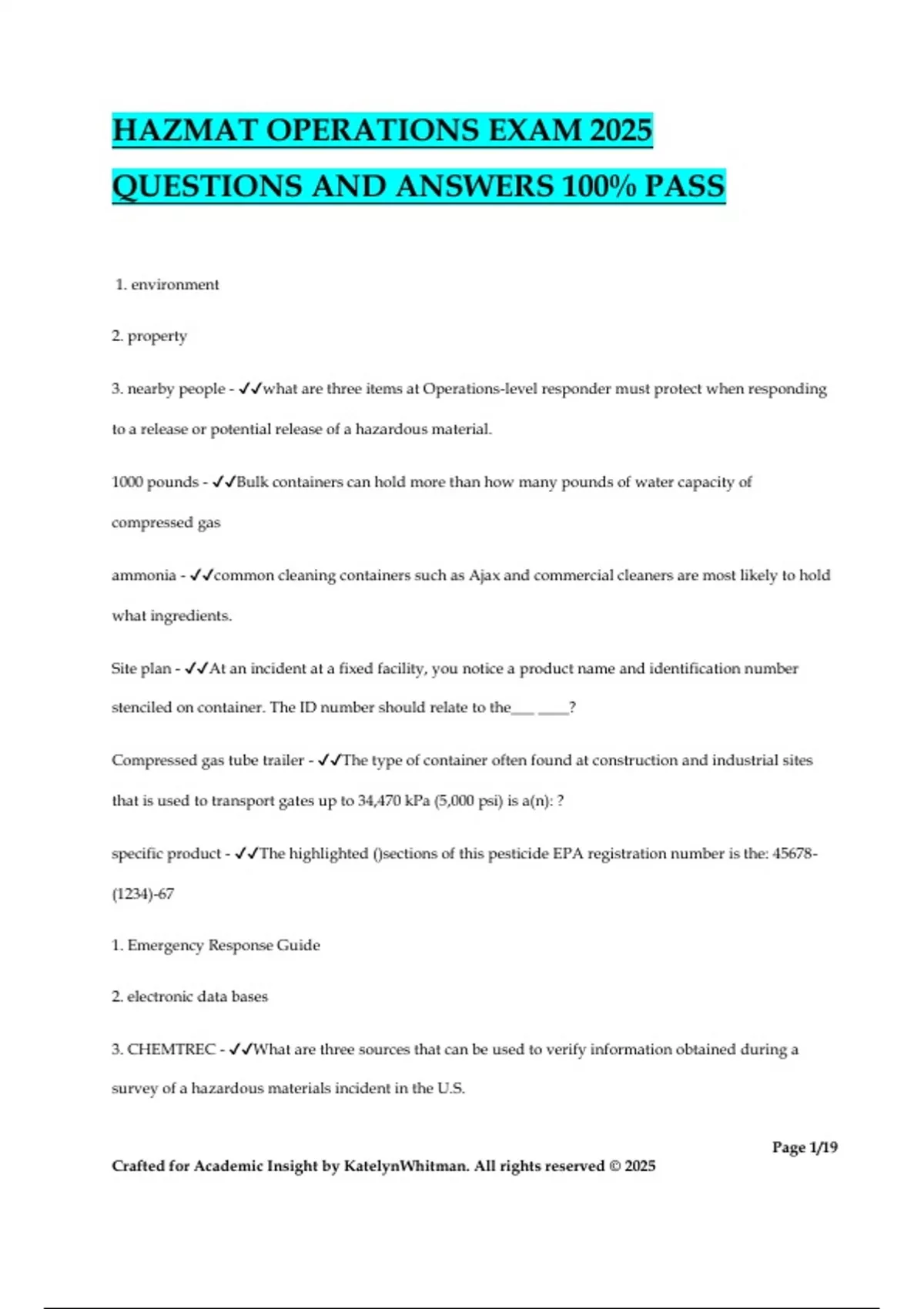 HAZMAT OPERATIONS EXAM 2025 QUESTIONS AND ANSWERS 100% PASS 1. environment 2. property 3. nearby people - what are three items at Operations-level responder must protect when responding to a release or potential release of a hazardous material. 1000 pounds - Bulk containers can hold more than how many pounds of water capacity of compressed gas ammonia - common cleaning containers such as Ajax and commercial cleaners are most likely to hold what ingredients. Site plan - At an incident at a fixed facility, you notice a product name and identification number stenciled on container. The ID number should relate to the___ ____? Compressed gas tube trailer - The type of container often found at construction and industrial sites that is used to transport gates up to 34,470 kPa (5,000 psi) is a(n): ? specific product - The highlighted ()sections of this pesticide EPA registration number is the: 45678- (1234)-67 1. Emergency Response Guide 2. electronic data bases 3. CHEMTREC - What are three sources that can be used to verify information obtained during a survey of a hazardous materials incident in the U.S. Page 2/19 Crafted for Academic Insight by KatelynWhitman. All rights reserved © 2025 flammable liquids and combustable liquids - What are two types of materials that would be classified as Class 3 substances. 7 - At a site, your binoculars aren't strong enough to read the numbers on the placard but you do see a yellow and white placard with a propeller-type icon. These materials are probably from Class: ? In the local emergency response plan. - information about the role of local, state and federal authorities during hazardous materials emergencies can be found where? The shipper and CHEMTREC/CANUTEC - What are two sources from which you can obtain a Safety Data Sheet? neutron radiation - The type of radiation that is the best shielded with a material that has a high hydrogen content is:? physical characteristics - The section on a SDS that shows the: boiling point, freezing point, vapor pressure, specific gravity, solubility in H2O % by Wt., Vapor Density, Appearance and Odor, pH and % Volatiles by VOL. is the? the contaminated material ingested or inhaled continues to emit radiation. - What happens when the radioactive contamination occurs and the person is removed from the endangered area is? Cone - (Dispersion pattern)Liquid that flows with the topography and widens at the farthest point from the release site. Hemisphere - (Dispersion pattern) Usually occurs when there is no wind. Stream - (Dispersion pattern) Liquid flows with the topography but remains generally consistent in width for the length of the spill. Plume - (Dispersion pattern) Product drifts with the wind. Pool - (Dispersion Pattern) Spreads equally in all directions. Page 3/19 Crafted for Academic Insight by KatelynWhitman. All rights reserved © 2025 Violent rupture - What is the type of release that is associated with a runaway cracking? Flammability - What is a material's flash point is the primary characteristic used to determine its relative degree of: ? Nephrotoxin - Produces kidney damage. Hepatotoxin - Produces liver damage. Neurotoxin - Produces primary toxic effect on the nervous system Red - What color should a patient be tagged if they are seriously injured but has a chance of survival if immediate medical care is provided? Toxic - What type of Harm is a result from exposure to poison? Thermal - What type of harm is a result from exposure to hot and cold temperature extremes? Etiologic - What type of harm is a result from exposure to infectious substances? Mechanical - What type of harm is a result form contact with scattering