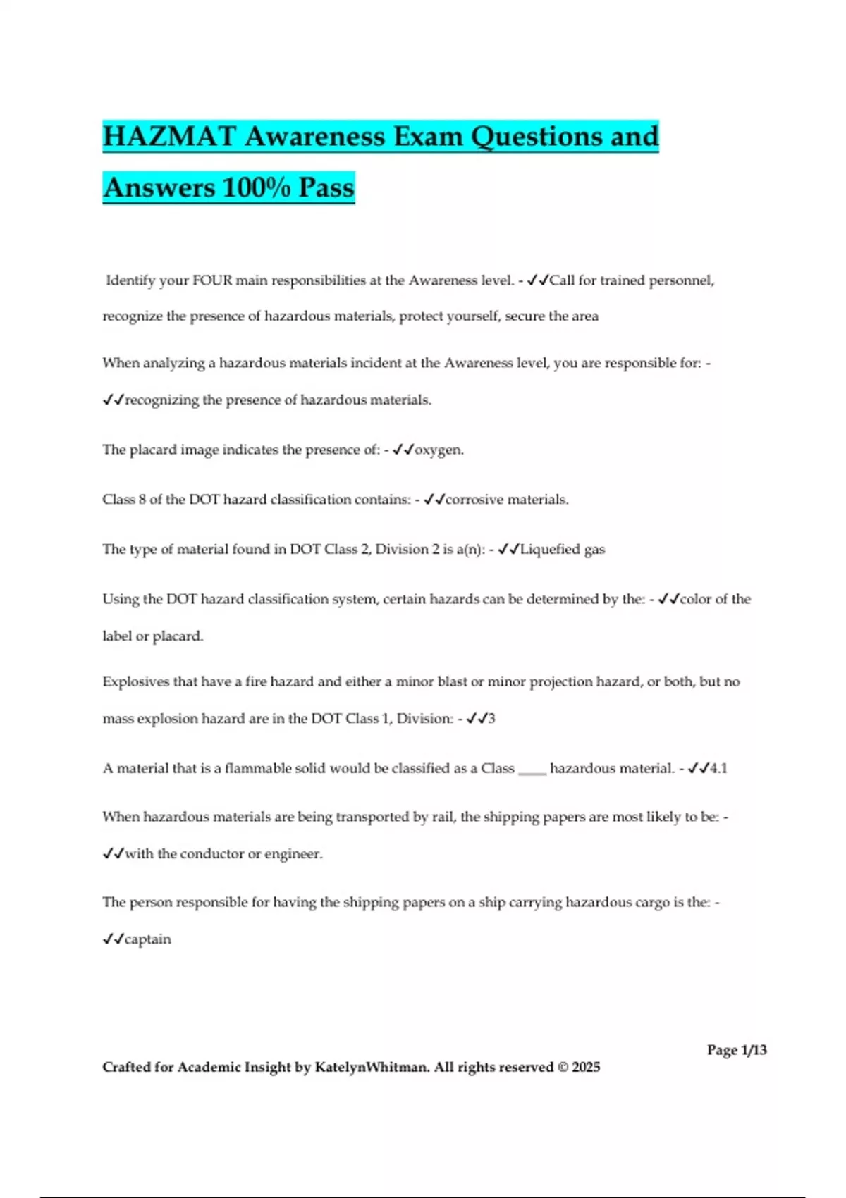 HAZMAT Awareness Exam Questions and Answers 100% Pass Identify your FOUR main responsibilities at the Awareness level. - Call for trained personnel, recognize the presence of hazardous materials, protect yourself, secure the area When analyzing a hazardous materials incident at the Awareness level, you are responsible for: - recognizing the presence of hazardous materials. The placard image indicates the presence of: - oxygen. Class 8 of the DOT hazard classification contains: - corrosive materials. The type of material found in DOT Class 2, Division 2 is a(n): - Liquefied gas Using the DOT hazard classification system, certain hazards can be determined by the: - color of the label or placard. Explosives that have a fire hazard and either a minor blast or minor projection hazard, or both, but no mass explosion hazard are in the DOT Class 1, Division: - 3 A material that is a flammable solid would be classified as a Class ____ hazardous material. - 4.1 When hazardous materials are being transported by rail, the shipping papers are most likely to be: - with the conductor or engineer. The person responsible for having the shipping papers on a ship carrying hazardous cargo is the: - captain Page 2/13 Crafted for Academic Insight by KatelynWhitman. All rights reserved © 2025 Identify the THREE pieces of information that should always be printed on a pipeline warning sign. - emergency phone number; information about the pipeline contents; Ownership of the pipeline Match each NFPA 704 marking system description with the correct area on the NFPA marker. - Left (blue)=health, top (red)=fire, right (yellow)=reactivity, bottom (white)=special information Identify FOUR types of locations that could become targets for criminal or terrorist activity using hazardous materials - places of historical significance; mass transit systems; telecommunications facilities; military installations One limitation of using your senses to determine the presence of a hazardous material is that: - if you are close enough to sense hazardous materials, you may have already endangered yourself. At a fixed facility, the best places to look for the names of the hazardous materials are the SDS and the: - emergency planning documents corrosive material that damages the skin or body tissue is considered exposure by: - contact Using your sense of smell to identify a hazardous material can put you at risk of exposure by way of: - inhalation When analyzing a hazardous materials incident at the Awareness level, you are responsible for: - thermal=caused by exposure to extreme temperatures; poisonous=materials that are toxic to humans in inhaled, swallowed, absorbed, or enter through breaks in the skin; corrosive=can destroy body tissue on contact; Etiologic=living microscopic organisms, like germs, that can enter the body To find the appropriate guide page within the Emergency Response Guidebook, you must: - use the four-digit identification number or product name of the material. Terrorist incidents characterized by the rapid onset of medical symptoms and easily observed signatures are: - chemical incidents Page 3/13 Crafted for Academic Insight by KatelynWhitman. All rights reserved © 2025 Petroleum and hazardous liquid pipeline structures include: - pump stations The onset of symptoms from a biological terrorist incident: - depends on the biological agent used Identify the Emergency Response Guidebook that is opened to the section that lists the UN/NA numbers in order. - Yellow bordered pages Information about a material's health hazards will be found in the: - Potential Hazard area of the orange guide pages in the ERG. Use Guide 111 in the Emergency Response Guidebook: - only until more specific information is available. Responder Cooley hears a loud hissing noise coming from the area where gas pipeline markings have been identified. He believes that he is dealing with a gas pipeline rupture. Responder Cooley should: - evacuate the area to where he can no longer hear, see, or smell gas. The type of protective action that requires you to keep everyone who is not directly involved in the emergency response operations, including unprotected emergency responders, away from the incident area is known as: - isolating the area and denying entry A typical situation when you should use the isolation distances found in the ERG's orange guide pages is when: - a hazardous material is exposed to fire. Among other things, the Initial Protective Action Distance for a material involved at an incident is based on the: - time of day Identify FOUR specific actions you should take when an incident is su