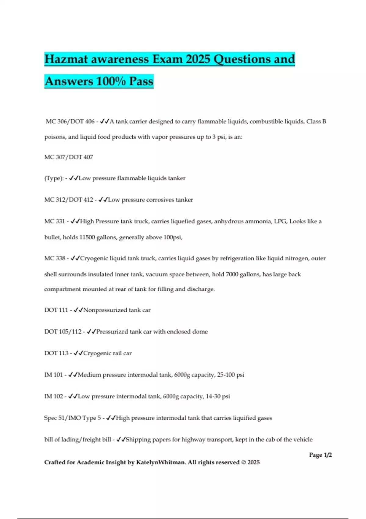 Hazmat awareness Exam 2025 Questions and Answers 100% Pass