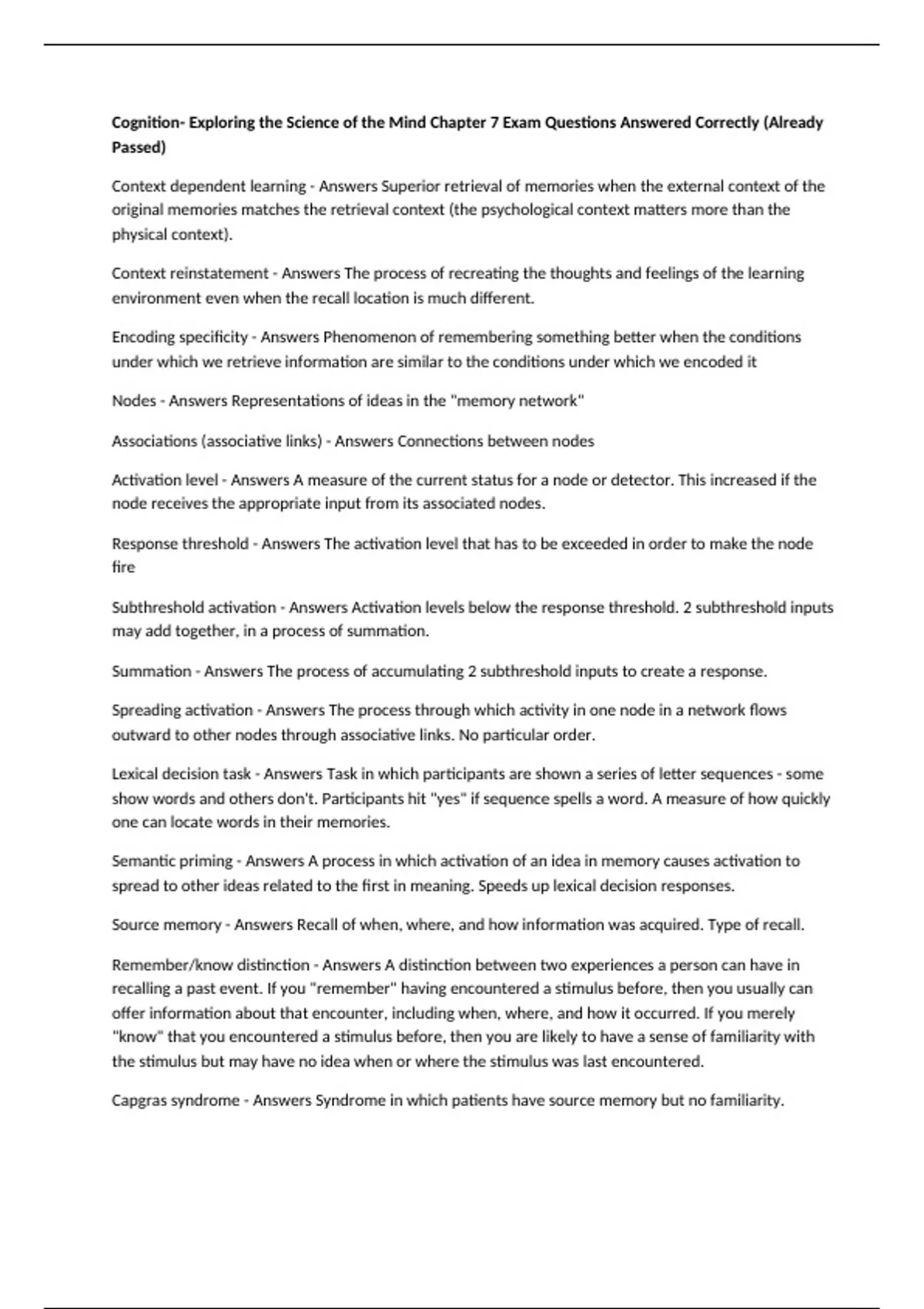 Encoding specificity - Answers Phenomenon of remembering something better when the conditions