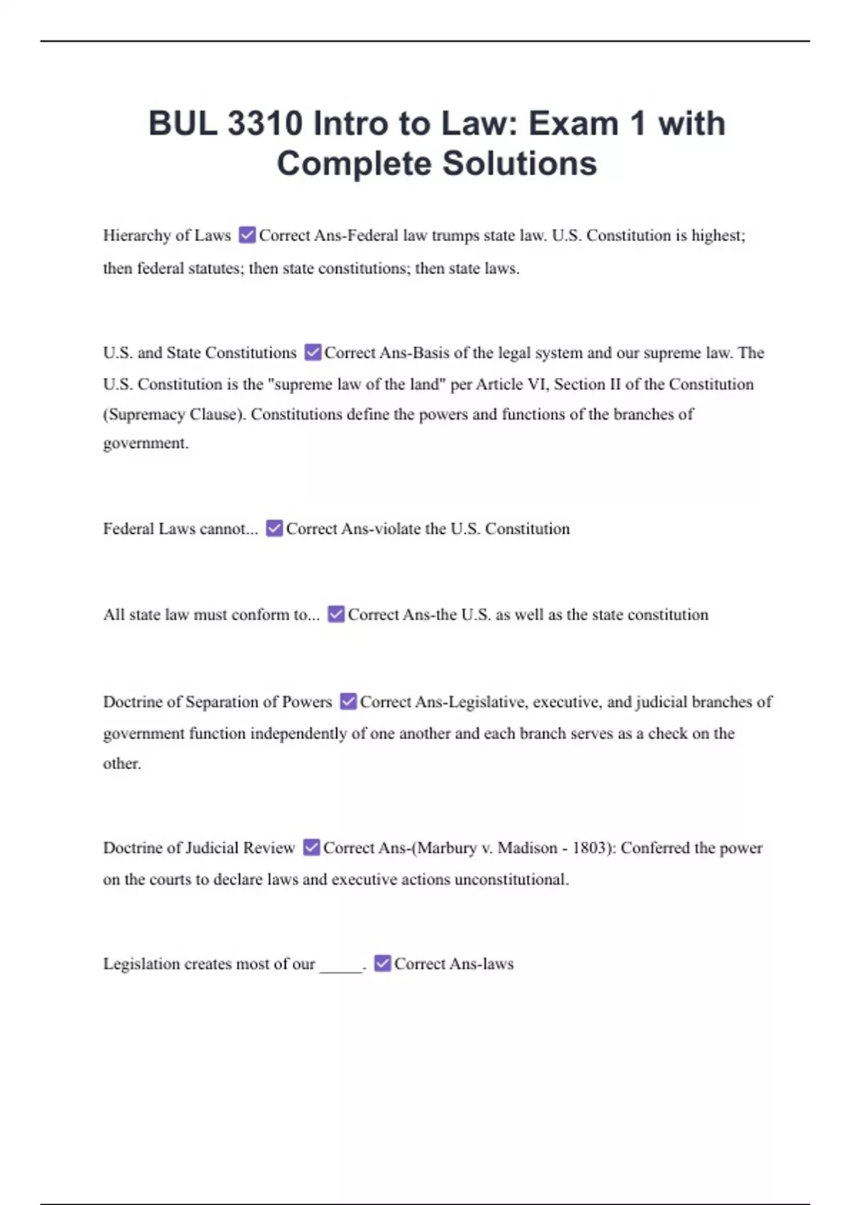 BUL 3310 Intro to Law: Exam 1 with Complete Solutions