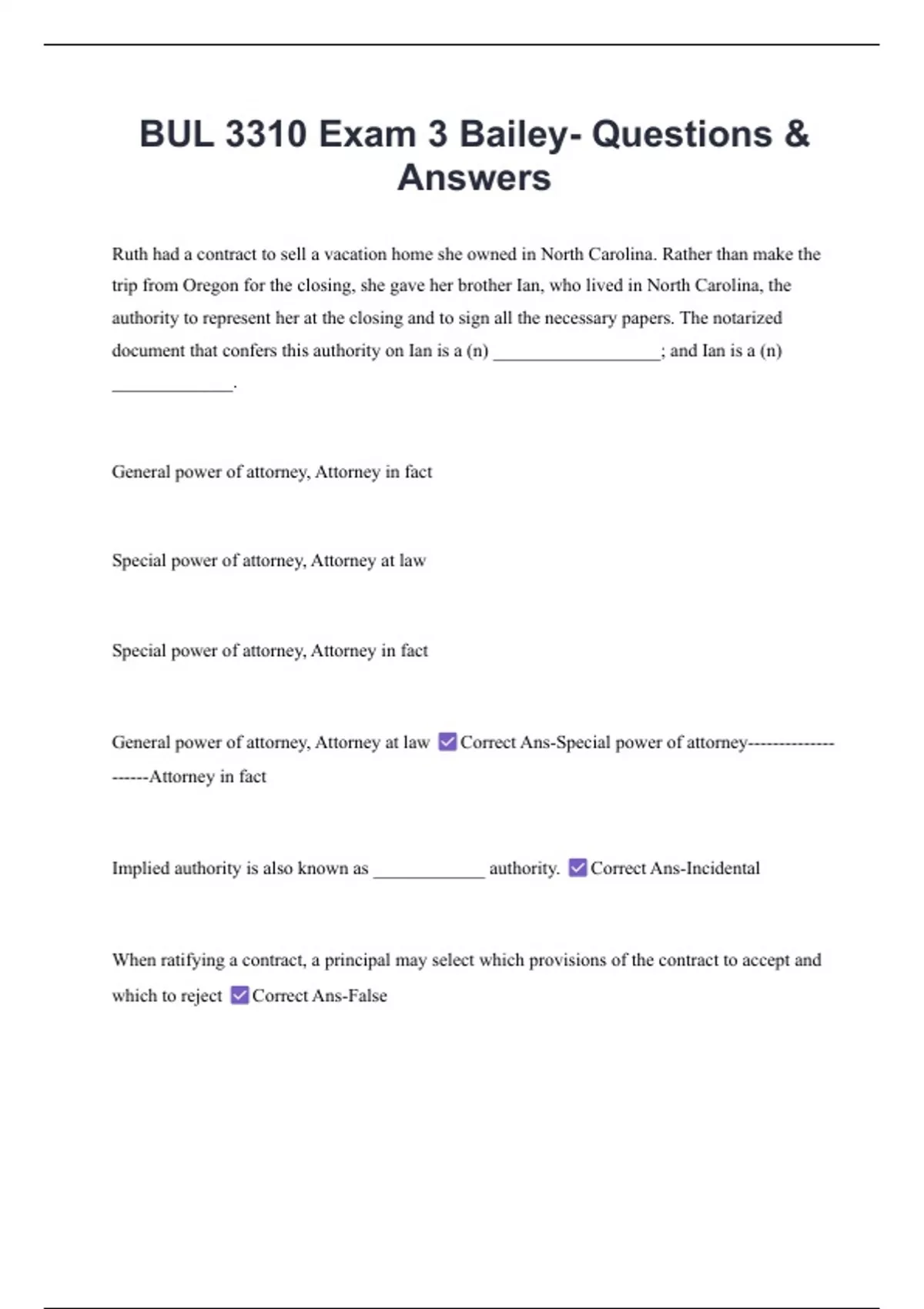 General power of attorney, Attorney at law Correct Ans-Special power of attorney--------------
