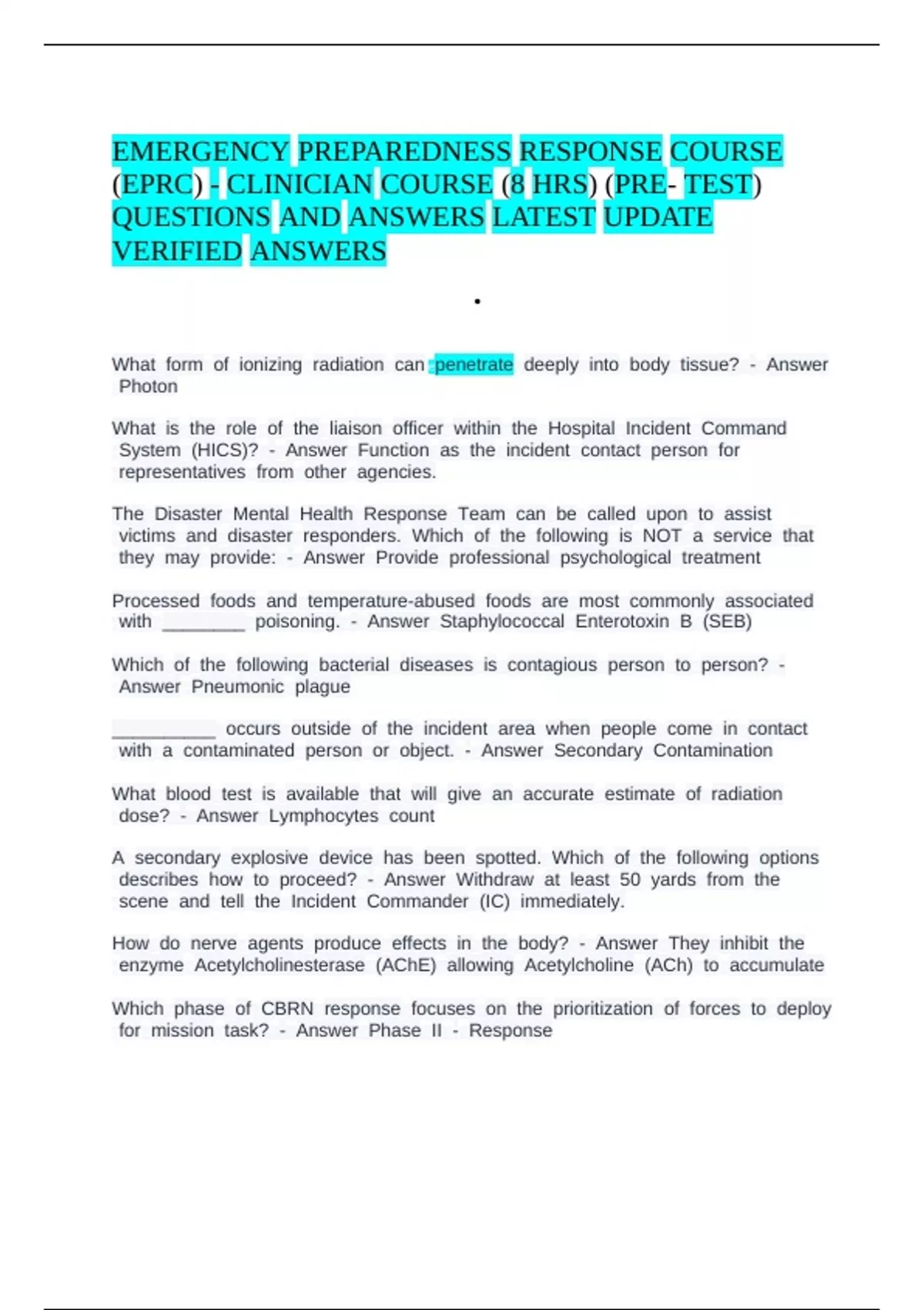 Emergency Preparedness Response Course (EPRC) - Clinician Course (8 hrs) (pre- test) Questions And Answers Latest Update Verified Answers.
