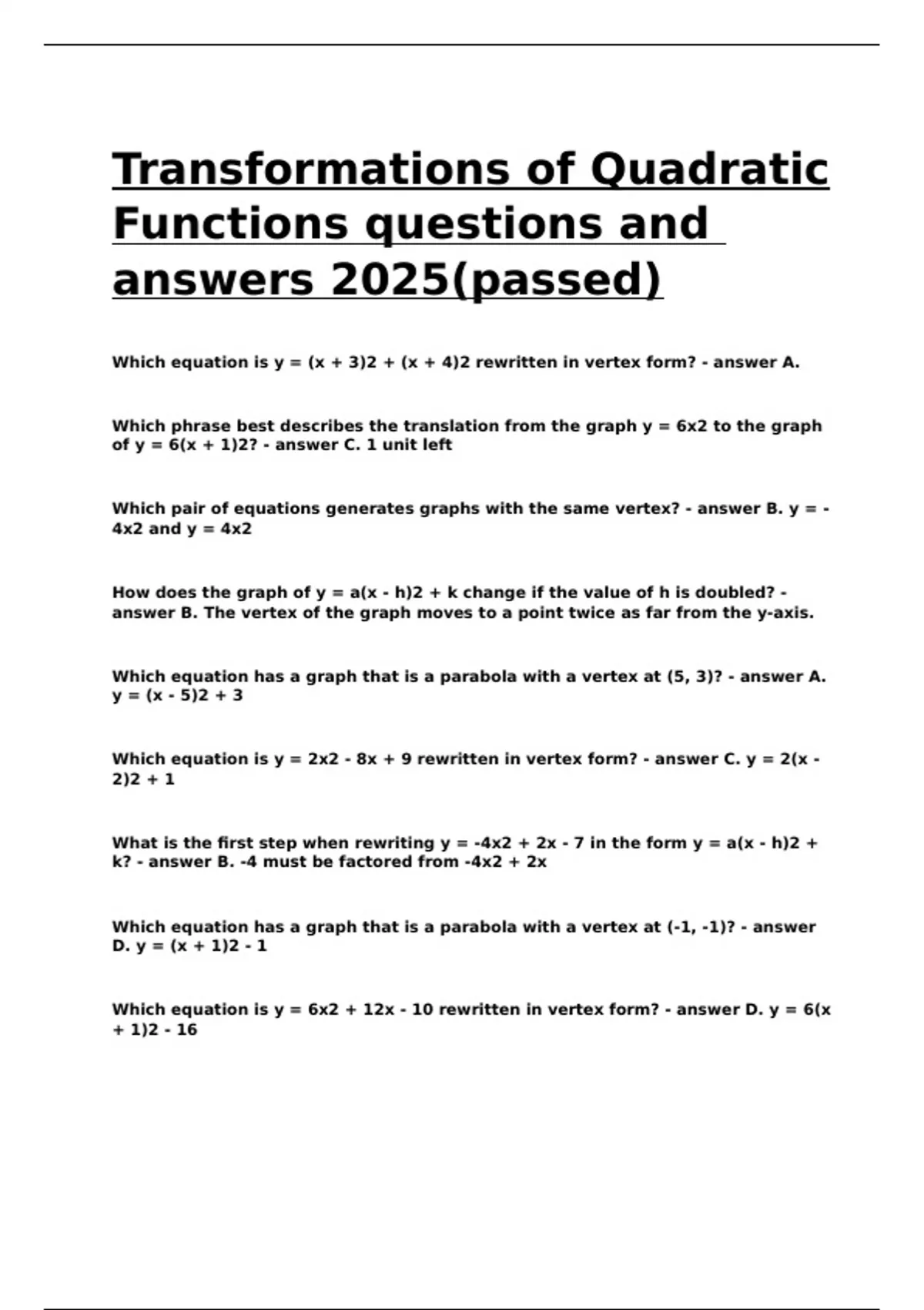 Transformations of Quadratic Functions questions and answers 2025(passed).