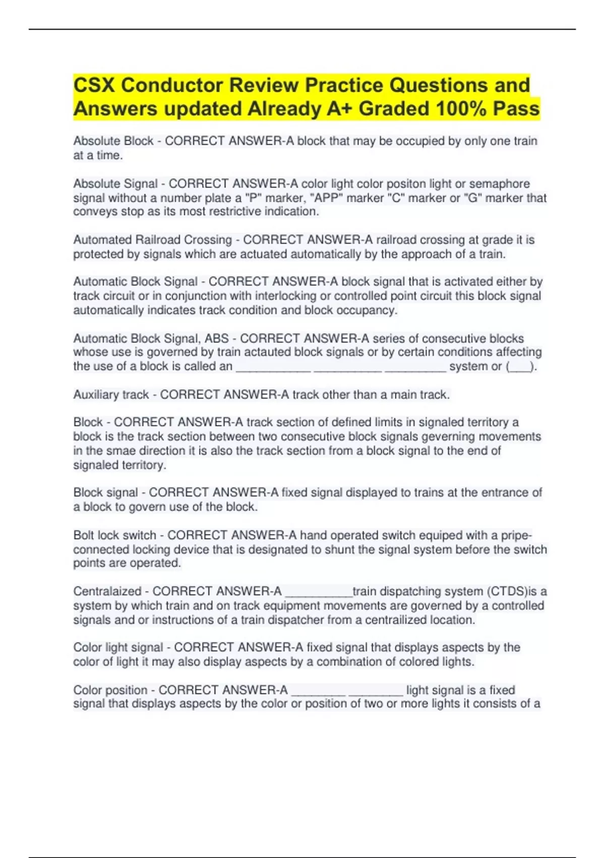Absolute Block - CORRECT ANSWER-A block that may be occupied by only one train