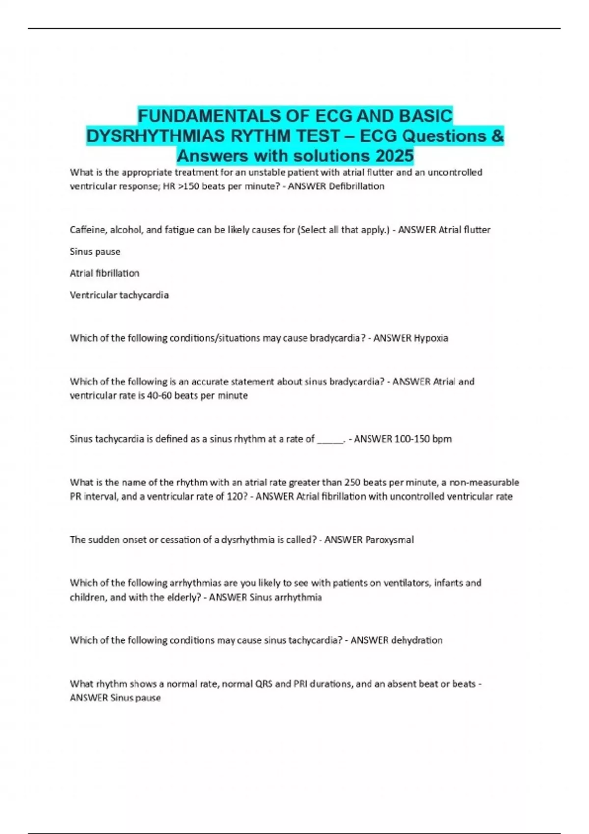 What is the appropriate treatment for an unstable patient with atrial flutter and an uncontrolled ventricular response; HR >150 beats per minute? - ANSWER Defibrillation Caffeine, alcohol, and fatigue can be likely causes for (Select all that apply.) - ANSWER Atrial flutter Sinus pause Atrial fibrillation Ventricular tachycardia Which of the following conditions/situations may cause bradycardia? - ANSWER Hypoxia Which of the following is an accurate statement about sinus bradycardia? - ANSWER Atrial and ventricular rate is 40-60 beats per minute Sinus tachycardia is defined as a sinus rhythm at a rate of _____. - ANSWER 100-150 bpm What is the name of the rhythm with an atrial rate greater than 250 beats per minute, a non-measurable PR interval, and a ventricular rate of 120? - ANSWER Atrial fibrillation with uncontrolled ventricular rate The sudden onset or cessation of a dysrhythmia is called? - ANSWER Paroxysmal Which of the following arrhythmias are you likely to see with patients on ventilators, infants and children, and with the elderly? - ANSWER Sinus arrhythmia Which of the following conditions may cause sinus tachycardia? - ANSWER dehydration What rhythm shows a normal rate, normal QRS and PRI durations, and an absent beat or beats - ANSWER Sinus pause A way to determine if you are looking at a junctional or atrial arrhythmia is to look at the ECG characteristics of the _____. - ANSWER P-Wave