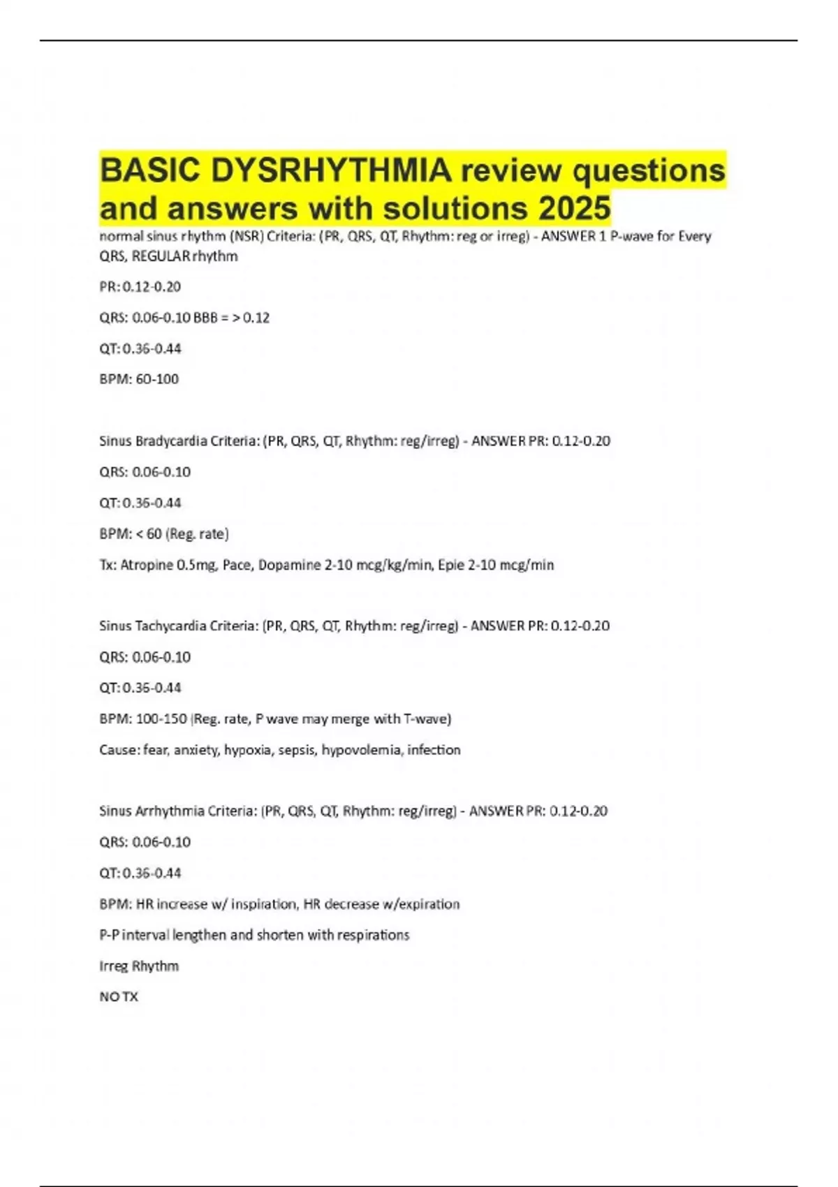 normal sinus rhythm (NSR) Criteria: (PR, QRS, QT, Rhythm: reg or irreg) - ANSWER 1 P-wave for Every QRS, REGULAR rhythm PR: 0.12-0.20 QRS: 0.06-0.10 BBB = > 0.12 QT: 0.36-0.44 BPM: 60-100 Sinus Bradycardia Criteria: (PR, QRS, QT, Rhythm: reg/irreg) - ANSWER PR: 0.12-0.20 QRS: 0.06-0.10 QT: 0.36-0.44 BPM: < 60 (Reg. rate) Tx: Atropine 0.5mg, Pace, Dopamine 2-10 mcg/kg/min, Epie 2-10 mcg/min Sinus Tachycardia Criteria: (PR, QRS, QT, Rhythm: reg/irreg) - ANSWER PR: 0.12-0.20 QRS: 0.06-0.10 QT: 0.36-0.44 BPM: 100-150 (Reg. rate, P wave may merge with T-wave) Cause: fear, anxiety, hypoxia, sepsis, hypovolemia, infection Sinus Arrhythmia Criteria: (PR, QRS, QT, Rhythm: reg/irreg) - ANSWER PR: 0.12-0.20 QRS: 0.06-0.10 QT: 0.36-0.44 BPM: HR increase w/ inspiration, HR decrease w/expiration P-P interval lengthen and shorten with respirations Irreg Rhythm NO TX Sinus Pause Criteria: (PR, QRS, QT, Rhythm) - ANSWER