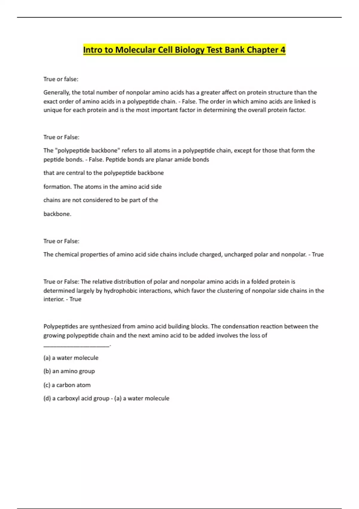 Intro to Molecular Cell Biology Test Bank Chapter 4 True or false: Generally, the total number of nonpolar amino acids has a greater affect on protein structure than the exact order of amino acids in a polypepƟde chain. - False. The order in which amino acids are linked is unique for each protein and is the most important factor in determining the overall protein factor. True or False: The "polypepƟde backbone" refers to all atoms in a polypepƟde chain, except for those that form the pepƟde bonds. - False. PepƟde bonds are planar amide bonds that are central to the polypepƟde backbone formaƟon. The atoms in the amino acid side chains are not considered to be part of the backbone. True or False: The chemical properƟes of amino acid side chains include charged, uncharged polar and nonpolar. - True True or False: The relaƟve distribuƟon of polar and nonpolar amino acids in a folded protein is determined largely by hydrophobic interacƟons, which favor the clustering of nonpolar side chains in the interior. - True PolypepƟdes are synthesized from amino acid building blocks. The condensaƟon reacƟon between the growing polypepƟde chain and the next amino acid to be added involves the loss of ____________________. (a) a water molecule (b) an amino group (c) a carbon atom (d) a carboxyl acid group - (a) a water molecule