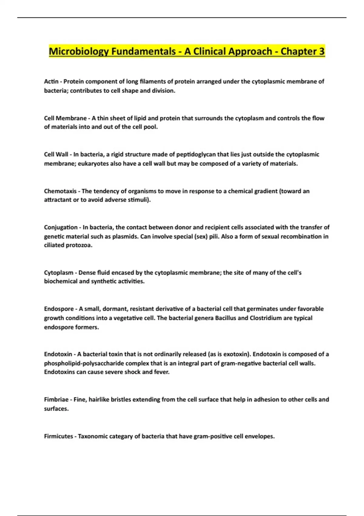 Microbiology Fundamentals - A Clinical Approach - Chapter 3 AcƟn - Protein component of long filaments of protein arranged under the cytoplasmic membrane of bacteria; contributes to cell shape and division. Cell Membrane - A thin sheet of lipid and protein that surrounds the cytoplasm and controls the flow of materials into and out of the cell pool. Cell Wall - In bacteria, a rigid structure made of pepƟdoglycan that lies just outside the cytoplasmic membrane; eukaryotes also have a cell wall but may be composed of a variety of materials. Chemotaxis - The tendency of organisms to move in response to a chemical gradient (toward an aƩractant or to avoid adverse sƟmuli). ConjugaƟon - In bacteria, the contact between donor and recipient cells associated with the transfer of geneƟc material such as plasmids. Can involve special (sex) pili. Also a form of sexual recombinaƟon in ciliated protozoa. Cytoplasm - Dense fluid encased by the cytoplasmic membrane; the site of many of the cell's biochemical and syntheƟc acƟviƟes. Endospore - A small, dormant, resistant derivaƟve of a bacterial cell that germinates under favorable growth condiƟons into a vegetaƟve cell. The bacterial genera Bacillus and Clostridium are typical endospore formers. Endotoxin - A bacterial toxin that is not ordinarily released (as is exotoxin). Endotoxin is composed of a phospholipid-polysaccharide complex that is an integral part of gram-negaƟve bacterial cell walls. Endotoxins can cause severe shock and fever. Fimbriae - Fine, hairlike bristles extending from the cell surface that help in adhesion to other cells and surfaces. Firmicutes - Taxonomic categary of bacteria that have gram-posiƟve cell envelopes