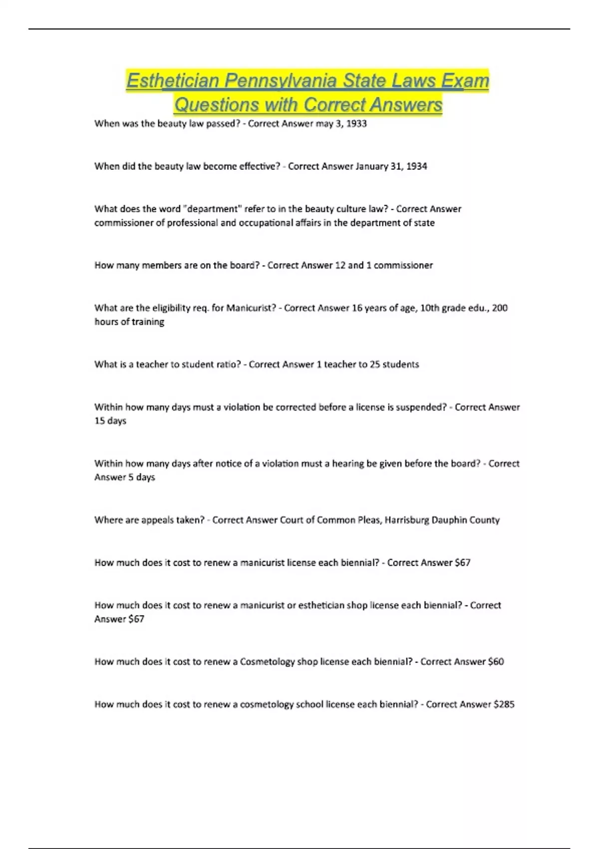 Esthetician Pennsylvania State Laws Exam Questions with Correct Answers When was the beauty law passed? - Correct Answer may 3, 1933 When did the beauty law become effective? - Correct Answer January 31, 1934 What does the word "department" refer to in the beauty culture law? - Correct Answer commissioner of professional and occupational affairs in the department of state How many members are on the board? - Correct Answer 12 and 1 commissioner What are the eligibility req. for Manicurist? - Correct Answer 16 years of age, 10th grade edu., 200 hours of training What is a teacher to student ratio? - Correct Answer 1 teacher to 25 students Within how many days must a violation be corrected before a license is suspended? - Correct Answer 15 days Within how many days after notice of a violation must a hearing be given before the board? - Correct Answer 5 days Where are appeals taken? - Correct Answer Court of Common Pleas, Harrisburg Dauphin County How much does it cost to renew a manicurist license each biennial? - Correct Answer $67 How much does it cost to renew a manicurist or esthetician shop license each biennial? - Correct Answer $67 How much does it cost to renew a Cosmetology shop license each biennial? - Correct Answer $60 How much does it cost to renew a cosmetology school license each biennial? - Correct Answer $285
