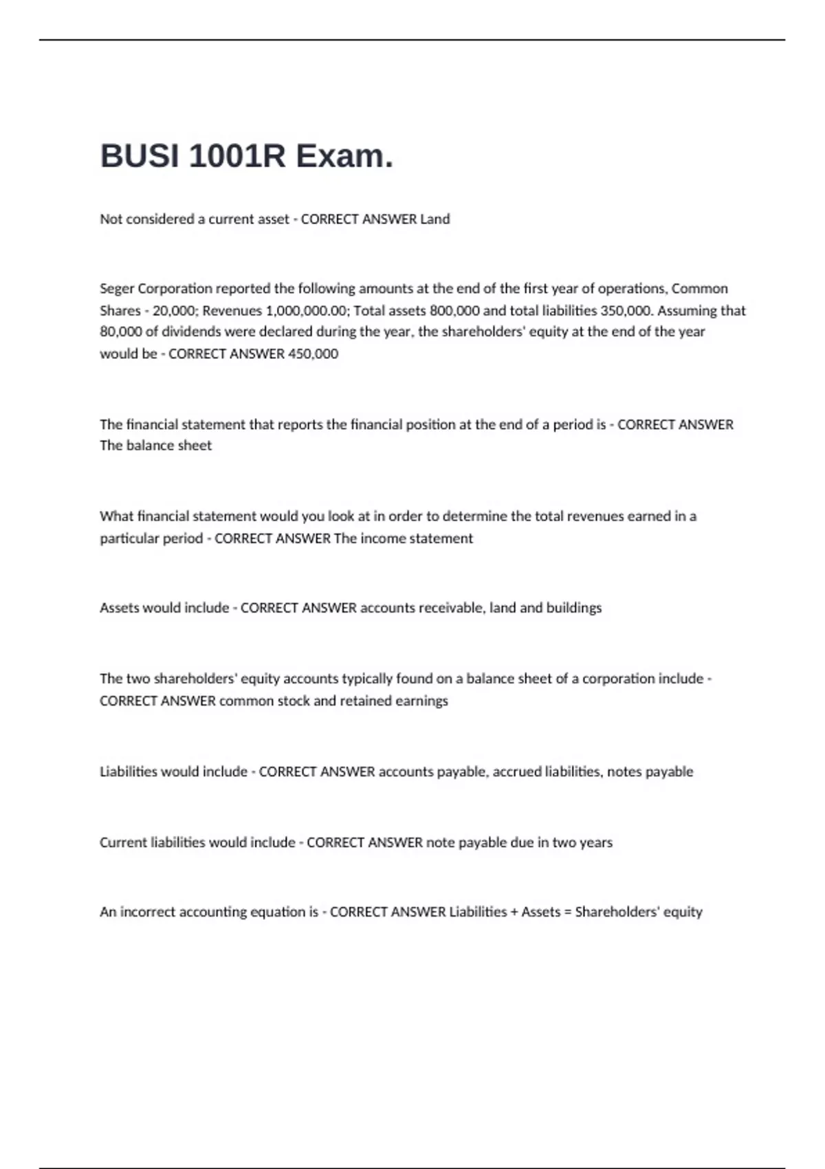 An incorrect accounting equation is - CORRECT ANSWER Liabilities + Assets = Shareholders' equity