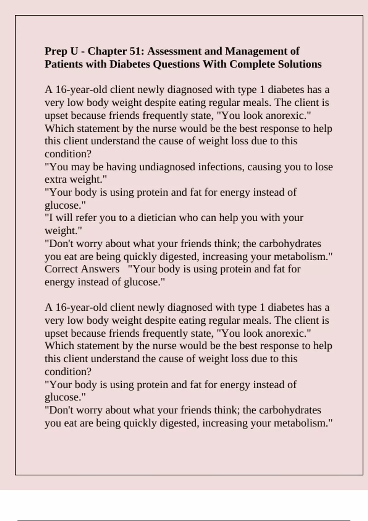 Prep U - Chapter 51: Assessment and Management of Patients with Diabetes Questions With Complete Solutions