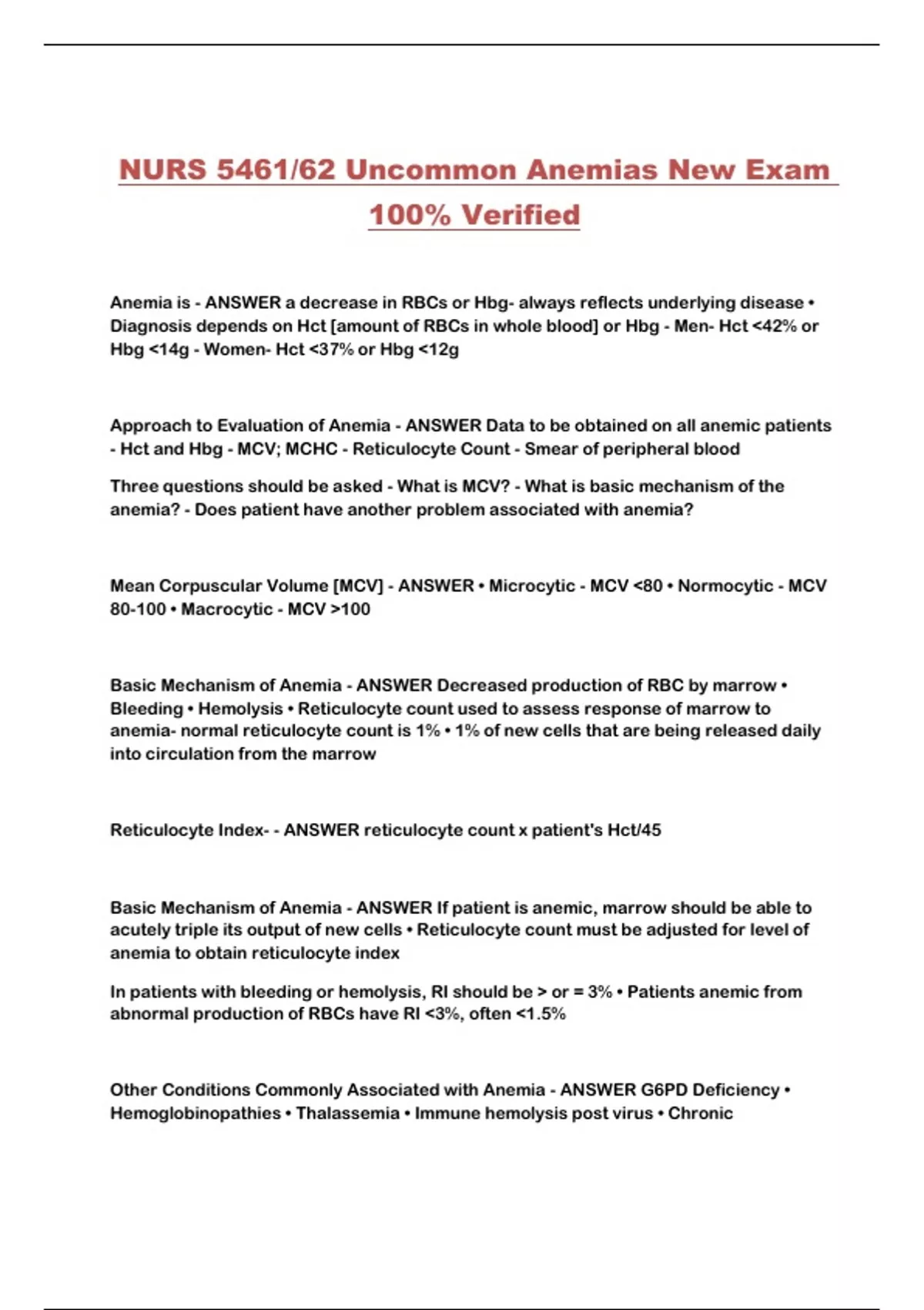 NURS 5461/62 Uncommon Anemias New Exam 100% Verified...