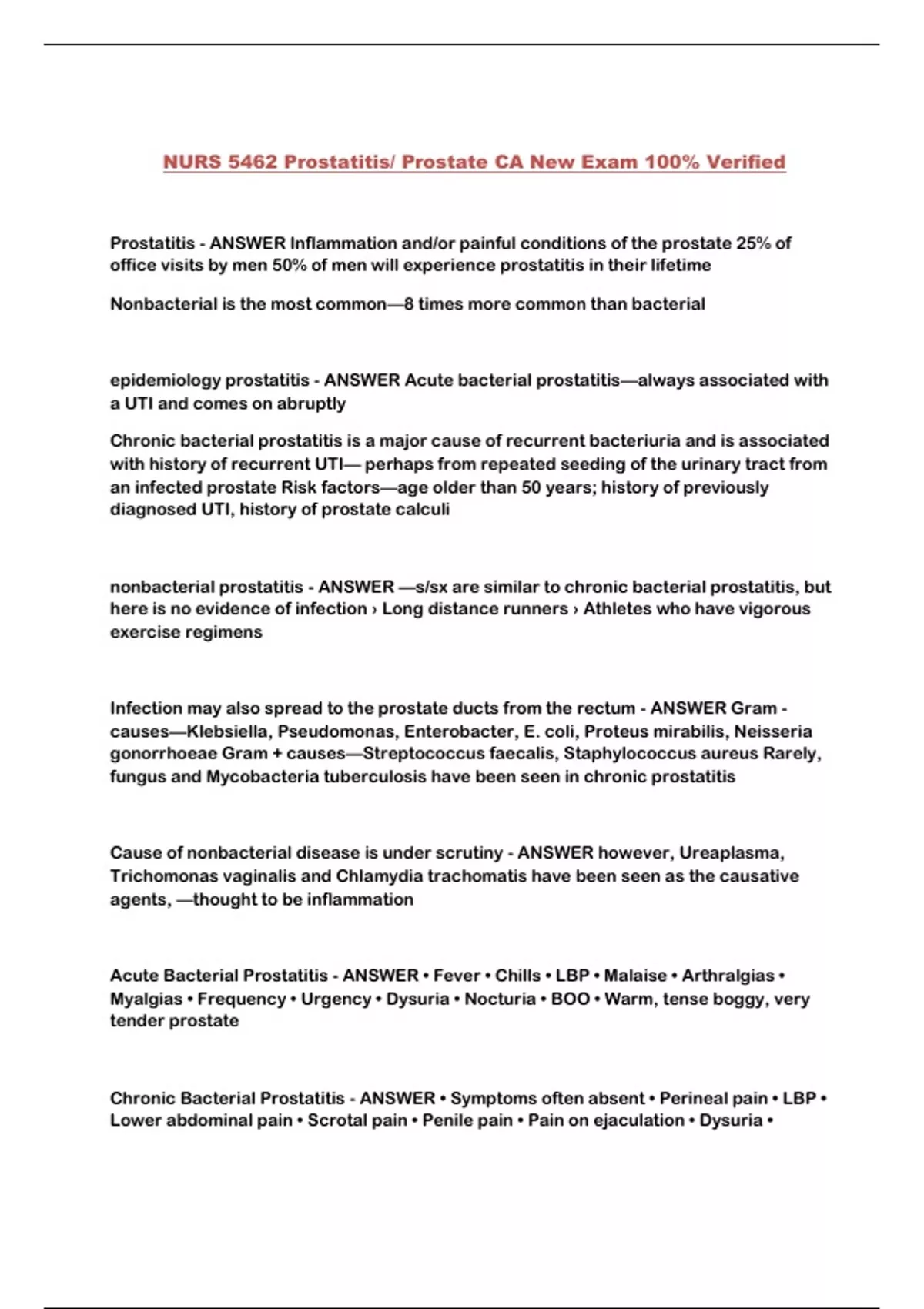 NURS 5462 Prostatitis/ Prostate CA New Exam 100% Verified