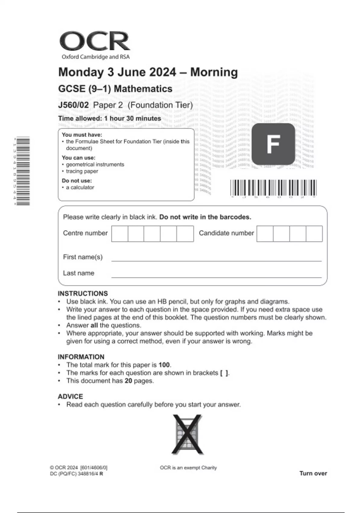 OCR GCSE Mathematics Paper 2 (Foundation Tier) JUNE 2024 QUESTION PAPER
