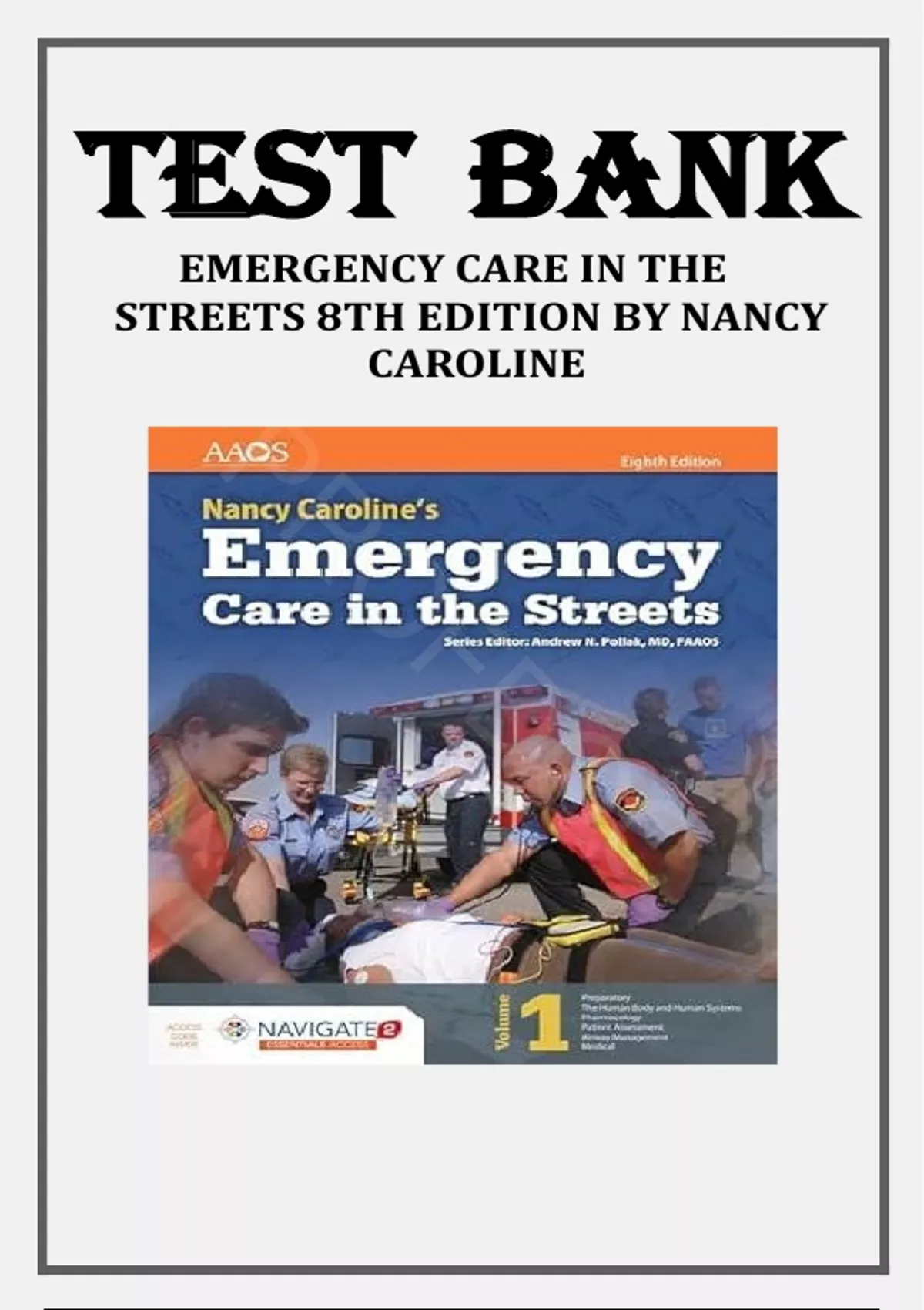TEST BANK FOR Nancy Caroline’s Emergency Care in the Streets 8th Edition by Nancy L. Caroline & American Academy of Orthopaedic Surgeons , ISBN: 9781284104882 |ALL CHAPTERS VERIFIED| Complete Guide A+