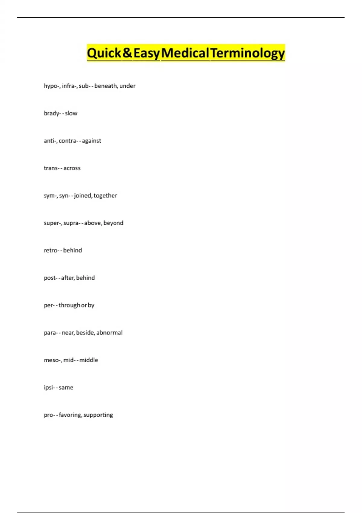 Quickij&ijEasyijMedicalijTerminology hypo-,ijinfra-,ijsub-ijijbeneath,ijunder brady-ijijslow anƟ-,ijcontra-ijijagainst trans-ijijacross sym-,ijsyn-ijijjoined,ijtogether super-,ijsupra-ijijabove,ijbeyond retro-ijijbehind post-ijijaŌer,ijbehind per-ijijthroughijorijby para-ijijnear,ijbeside,ijabnormal meso-,ijmid-ijijmiddle ipsi-ijijsame pro-ijijfavoring,ijsupporƟng mal-ijijbad eu-ijijgood,ijnormal dys-ijijbad,ijdifficult tachy-ijijfast in-ijijnotijorijinside(in) a-,ijan-ijijno,ijnot,ijwithout micro-ijijsmall macro-,ijmega-,ijmegalo-ijijlargeijorijgreat post-ijijaŌerijorijbehind ante-,ijpre-,ijpro-ijijbefore intra-ijijwithin