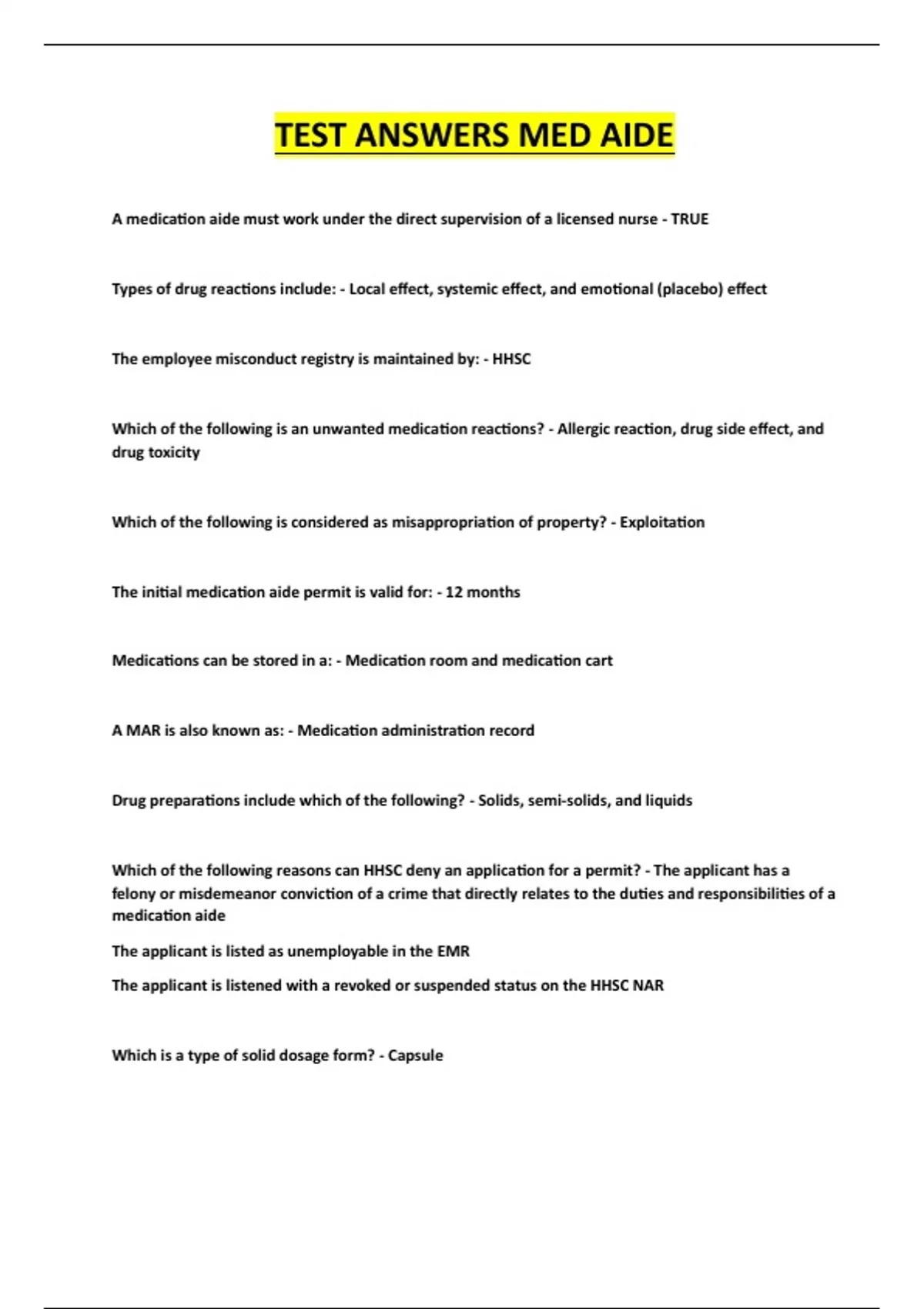 TEST ANSWERS MED AIDE A medicaƟon aide must work under the direct supervision of a licensed nurse - TRUE Types of drug reacƟons include: - Local effect, systemic effect, and emoƟonal (placebo) effect The employee misconduct registry is maintained by: - HHSC Which of the following is an unwanted medicaƟon reacƟons? - Allergic reacƟon, drug side effect, and drug toxicity Which of the following is considered as misappropriaƟon of property? - ExploitaƟon The iniƟal medicaƟon aide permit is valid for: - 12 months MedicaƟons can be stored in a: - MedicaƟon room and medicaƟon cart A MAR is also known as: - MedicaƟon administraƟon record Drug preparaƟons include which of the following? - Solids, semi-solids, and liquids Which of the following reasons can HHSC deny an applicaƟon for a permit? - The applicant has a felony or misdemeanor convicƟon of a crime that directly relates to the duƟes and responsibiliƟes of a medicaƟon aide The applicant is listed as unemployable in the EMR The applicant is listened with a revoked or suspended status on the HHSC NAR Which is a type of solid dosage form? - Capsule