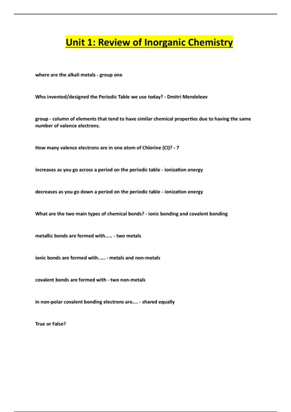 Unit 1: Review of Inorganic Chemistry