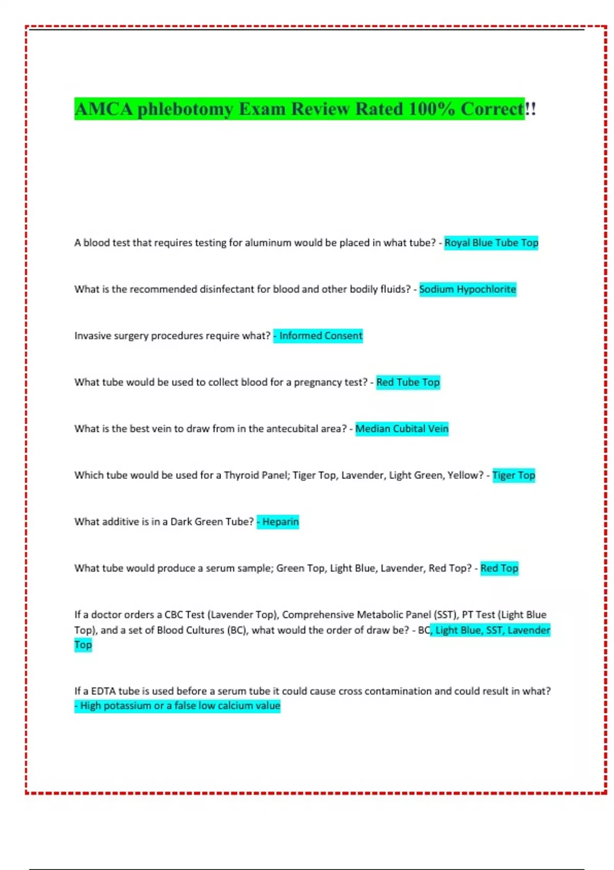 Top), and a set of Blood Cultures (BC), what would the order of draw be? - BC, Light Blue, SST, Lavender