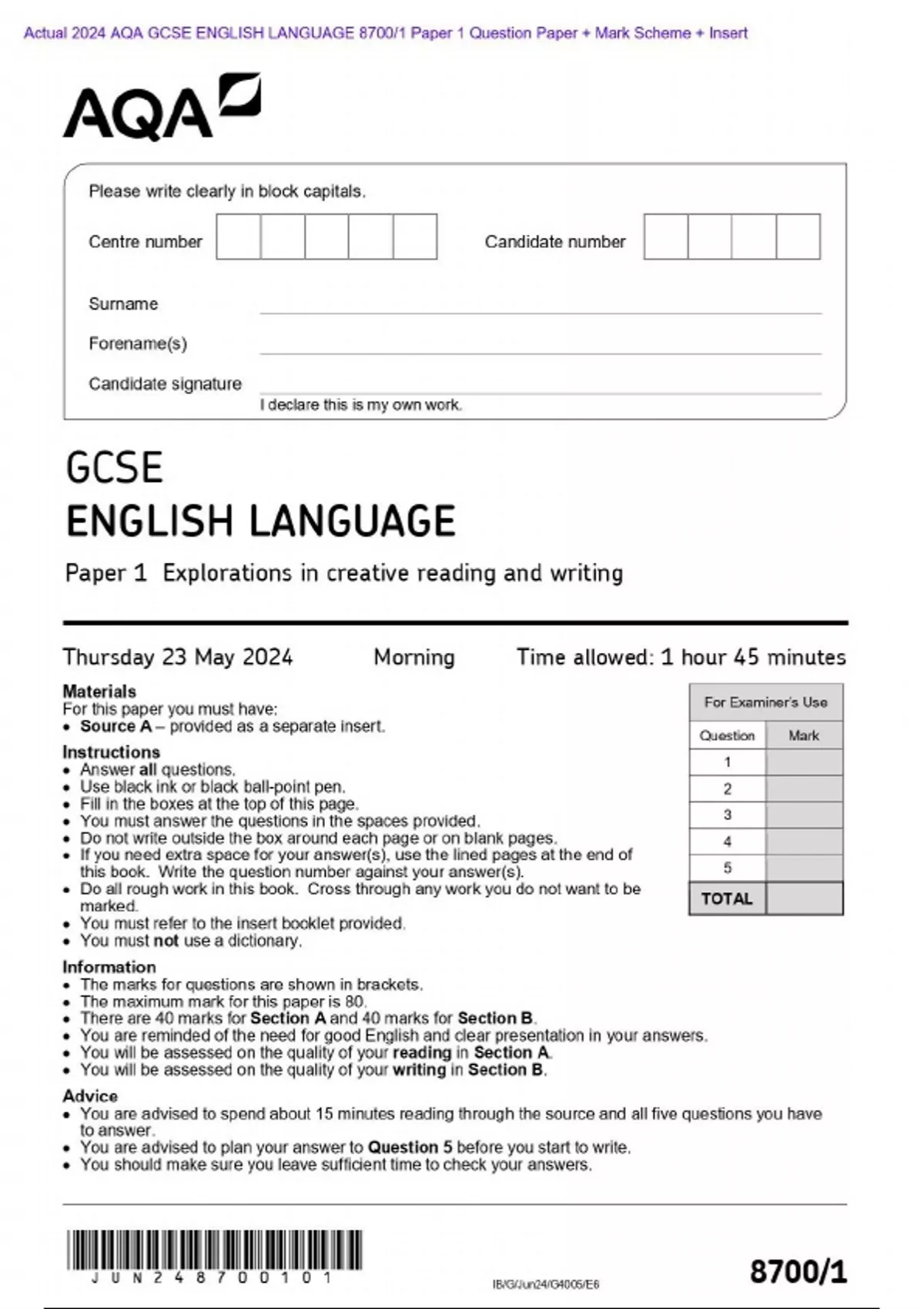 . Actual 2024 AQA GCSE ENGLISH LANGUAGE 8700/1 Pap