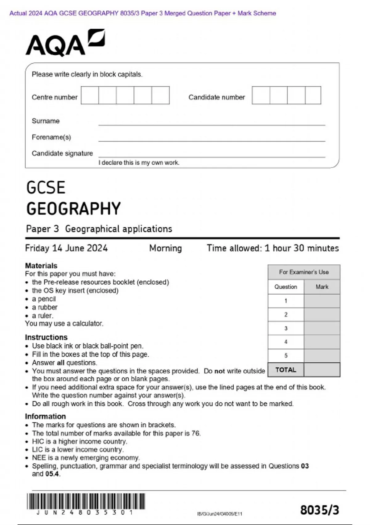 - Actual 2024 AQA GCSE GEOGRAPHY 8035/3 Paper 3 Merg