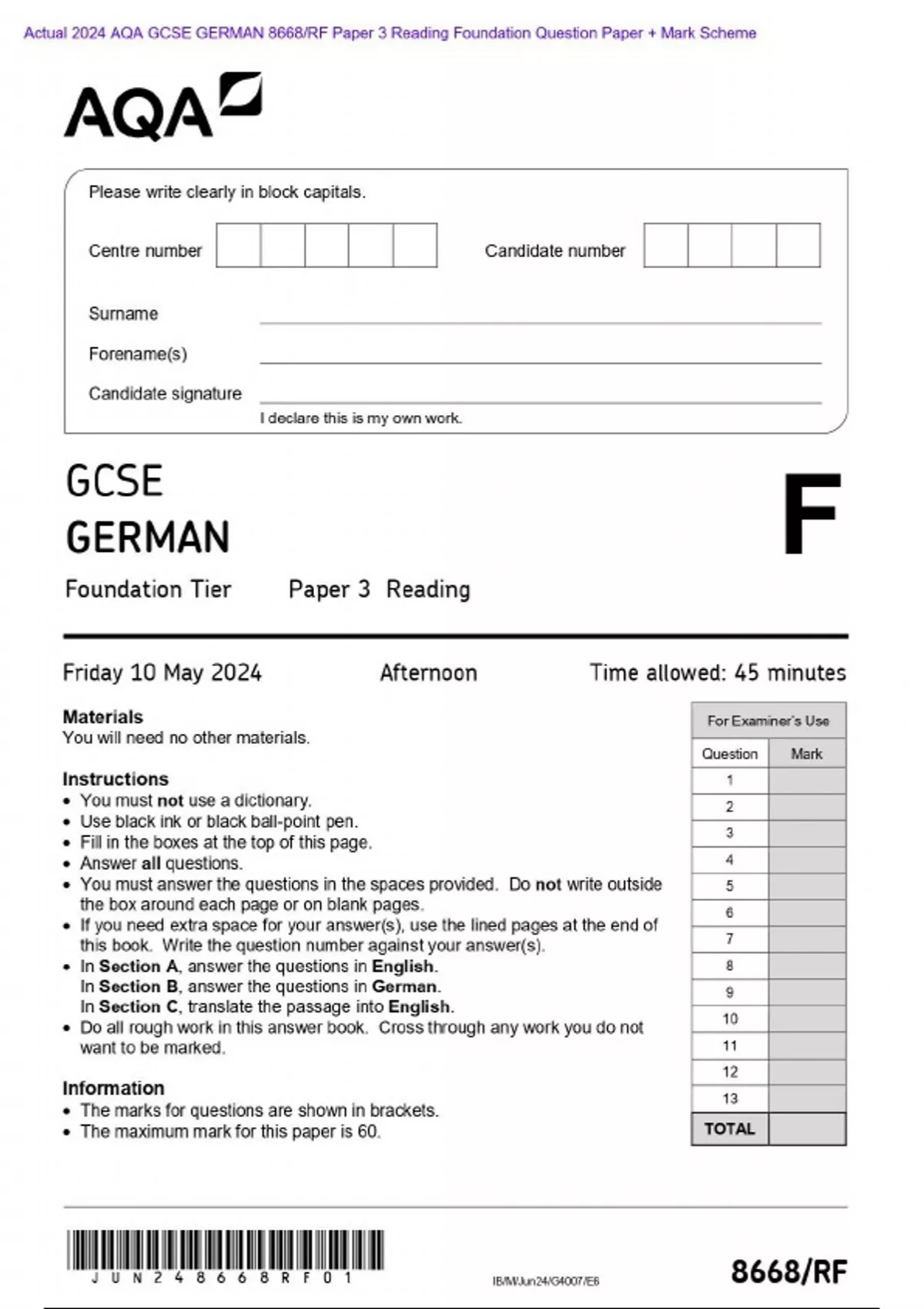 Actual 2024 AQA GCSE GERMAN 8668/RF Paper 3 Reading Foundation Question Paper + Mark Scheme