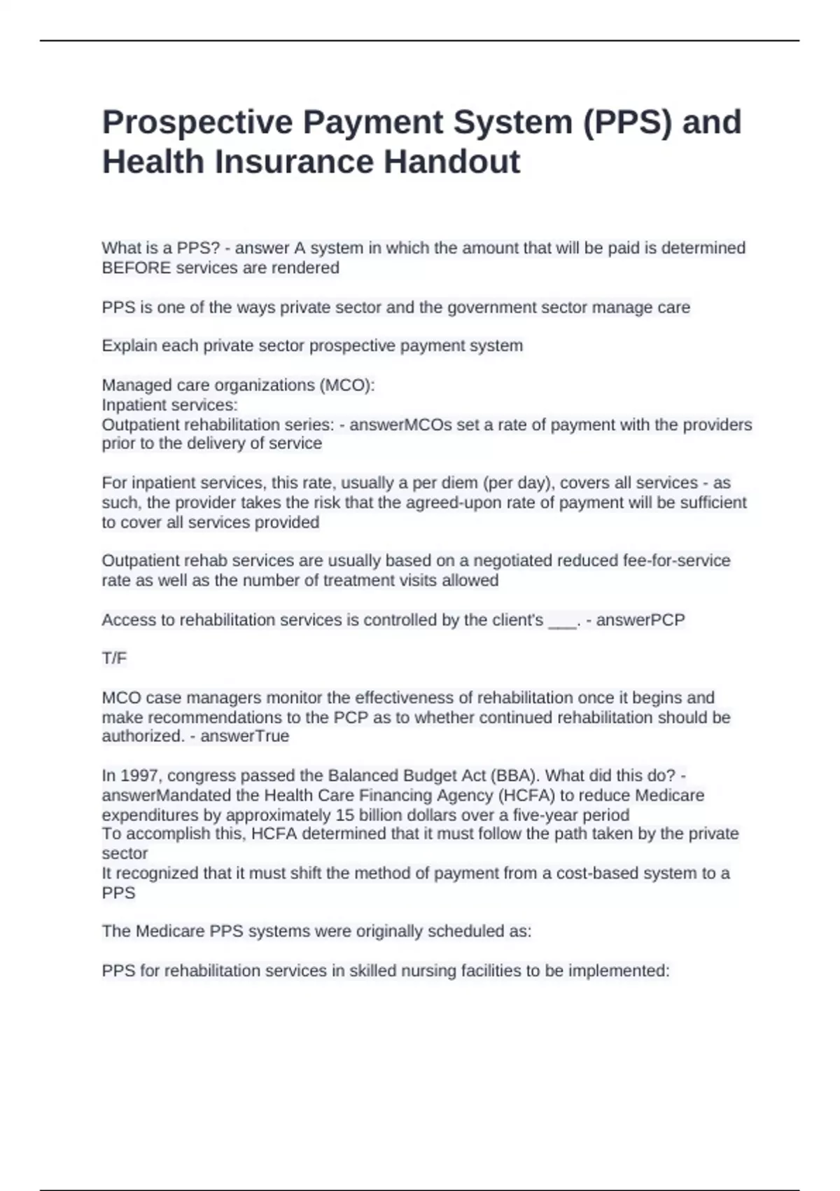 Prospective Payment System (PPS) and Health Insurance Handout Questions and Answers 100% Accurate