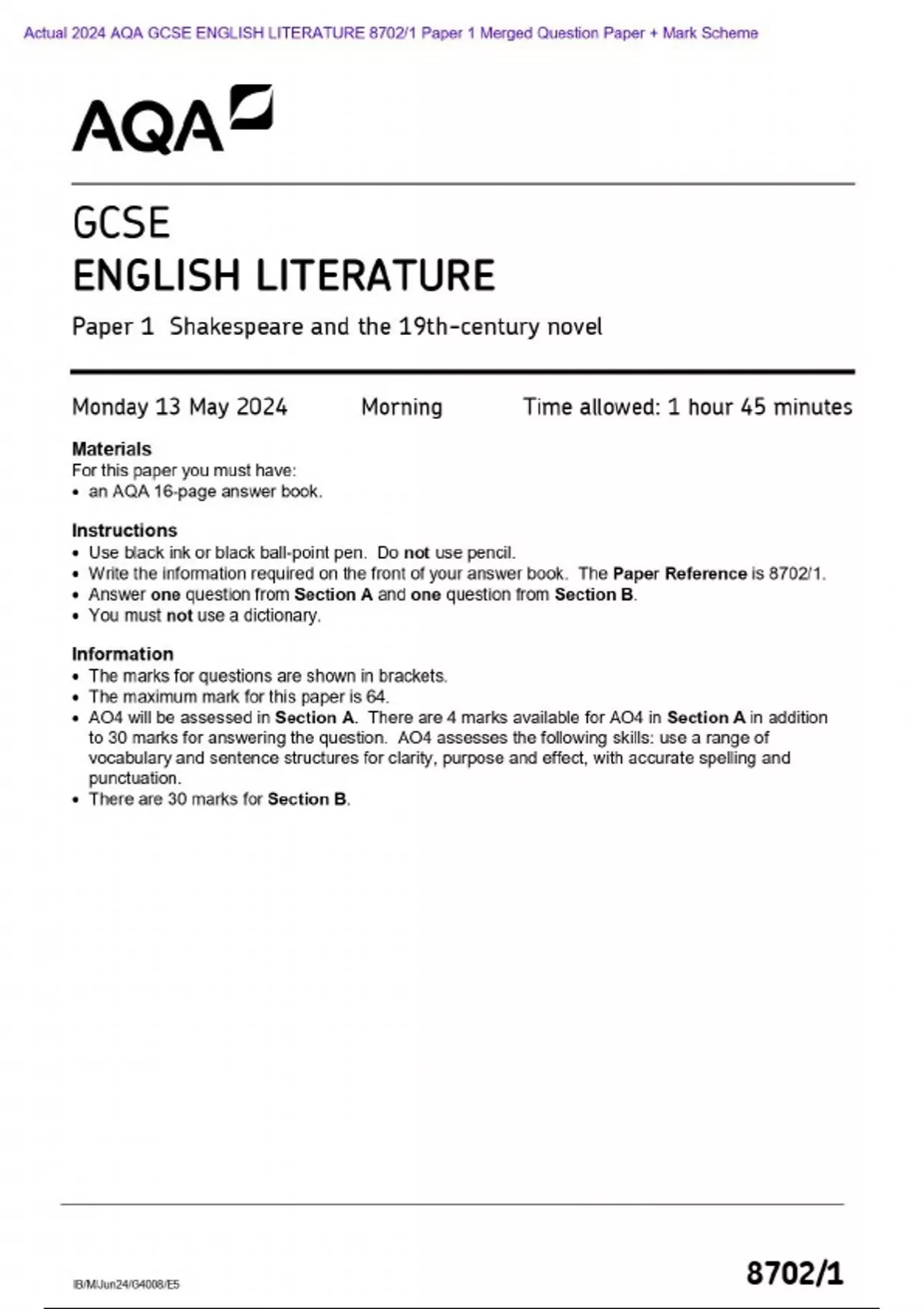 - Actual 2024 AQA GCSE ENGLISH LITERATURE 8702/1 Pap