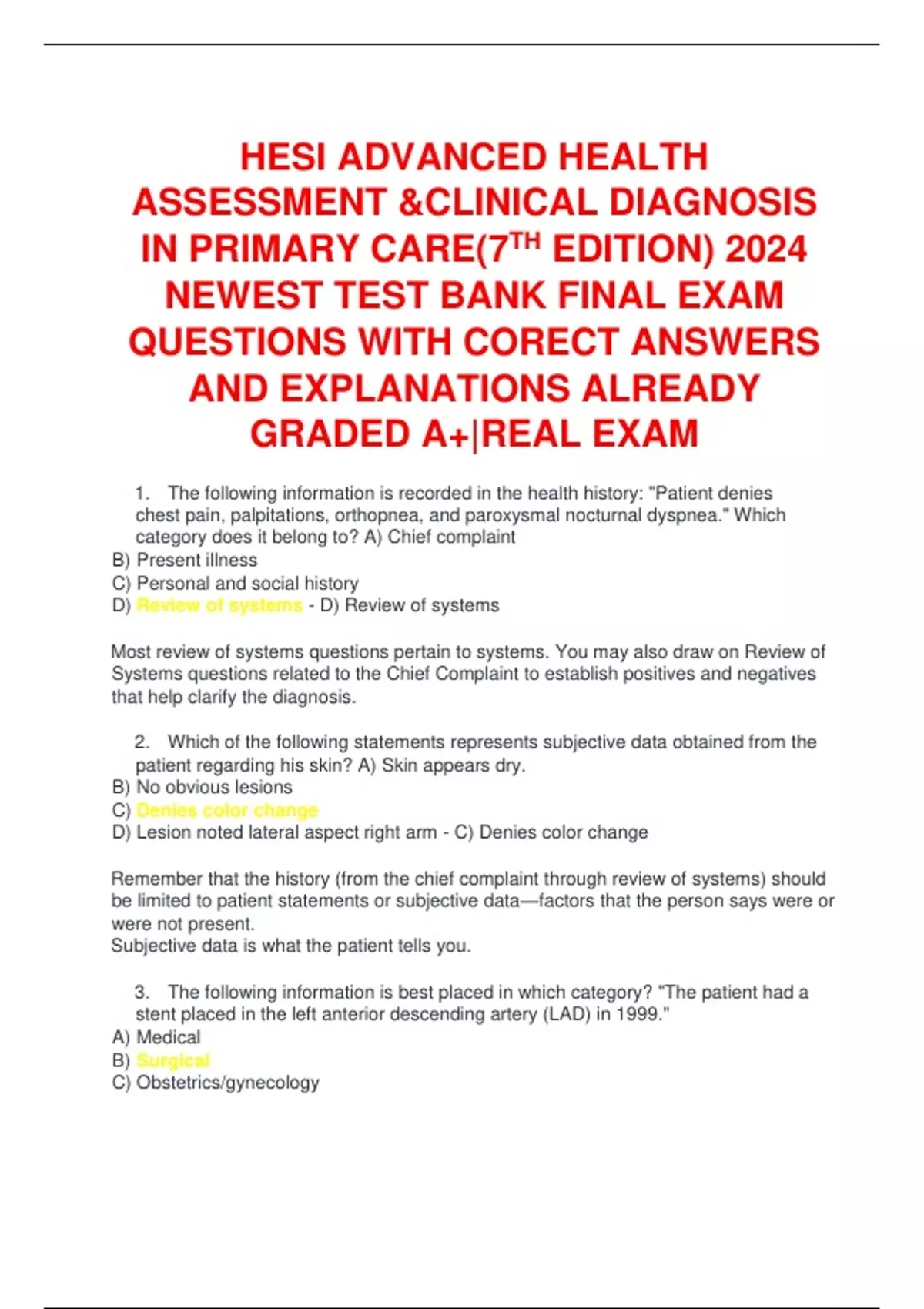 HESI ADVANCED HEALTH ASSESSMENT &CLINICAL DIAGNOSIS IN PRIMARY CARE(7TH EDITION) 2024 NEWEST TEST BANK FINAL EXAM QUESTIONS WITH CORECT ANSWERS AND EXPLANATIONS ALREADY GRADED A+|REAL EXAM