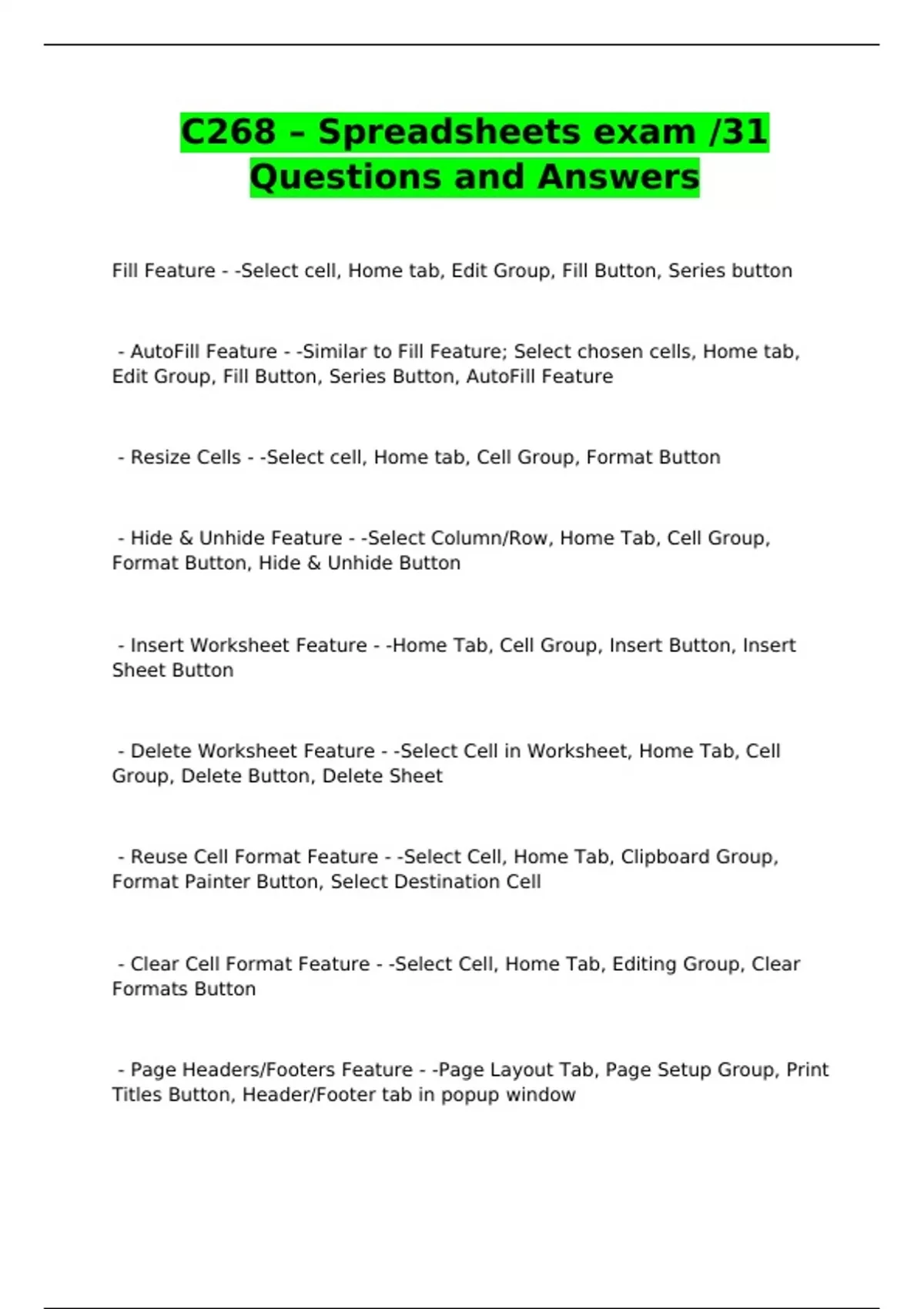 C268 – Spreadsheets exam /31 Questions and Answers