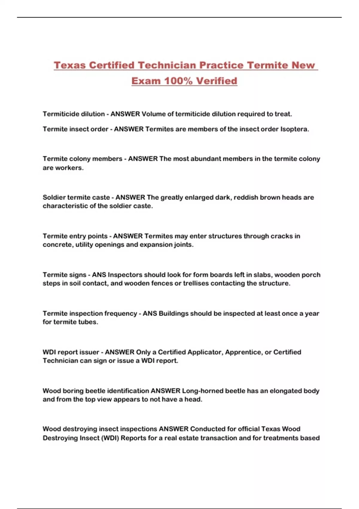 Texas Certified Technician Practice Termite New Exam 100% Verified...