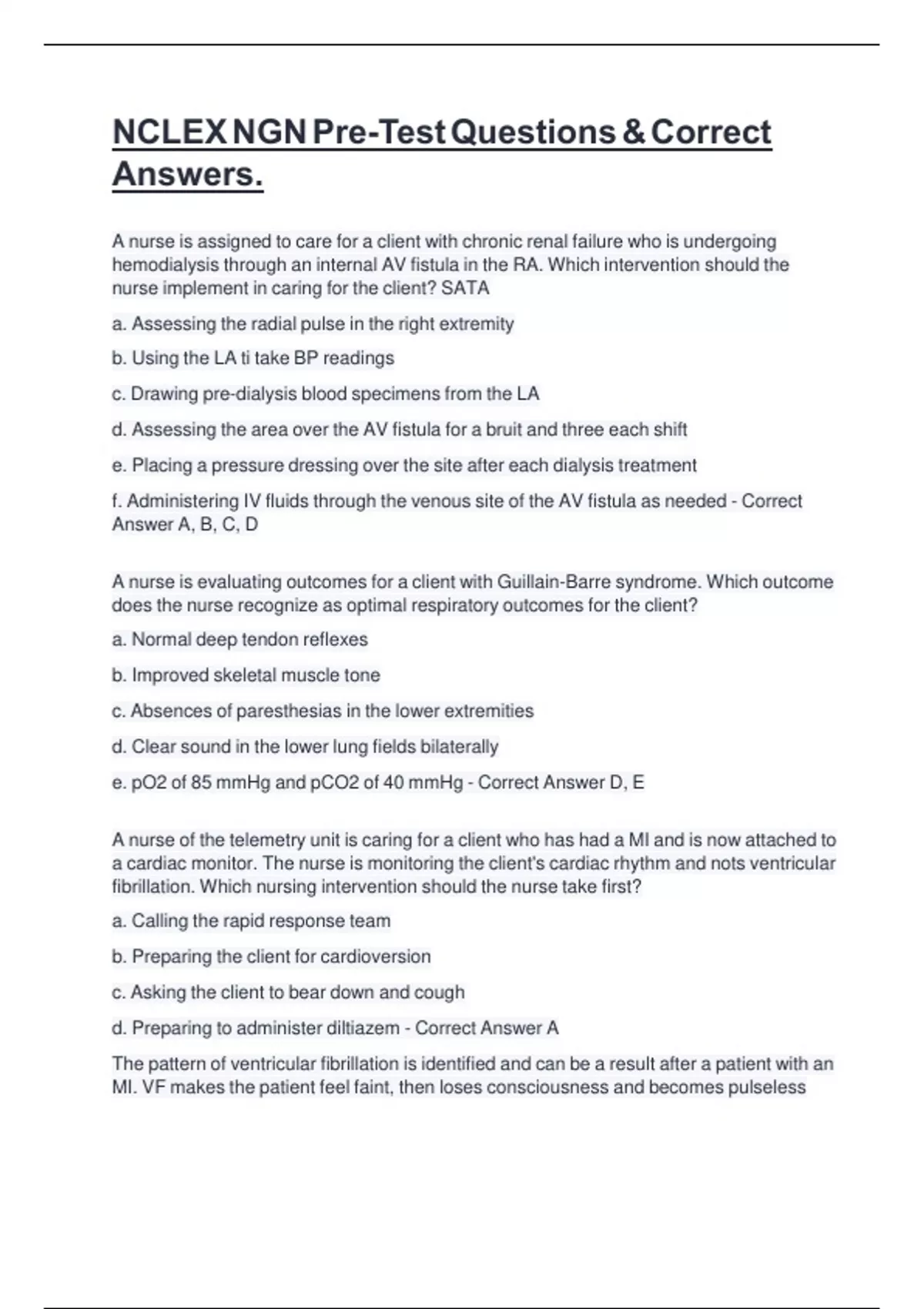 NCLEXNGNPre-TestQuestions&Correct Answers. A nurse is assigned to care for a client with chronic renal failure who is undergoing hemodialysis through an internal AV fistula in the RA. Which intervention should the nurse implement in caring for the client? SATA a. Assessing the radial pulse in the right extremity b. Using the LA ti take BP readings c. Drawing pre-dialysis blood specimens from the LA d. Assessing the area over the AV fistula for a bruit and three each shift e. Placing a pressure dressing over the site after each dialysis treatment f. Administering IV fluids through the venous site of the AV fistula as needed - Correct Answer A, B, C, D A nurse is evaluating outcomes for a client with Guillain-Barre syndrome. Which outcome does the nurse recognize as optimal respiratory outcomes for the client? a. Normal deep tendon reflexes b. Improved skeletal muscle tone c. Absences of paresthesias in the lower extremities d. Clear sound in the lower lung fields bilaterally e. pO2 of 85 mmHg and pCO2 of 40 mmHg - Correct A