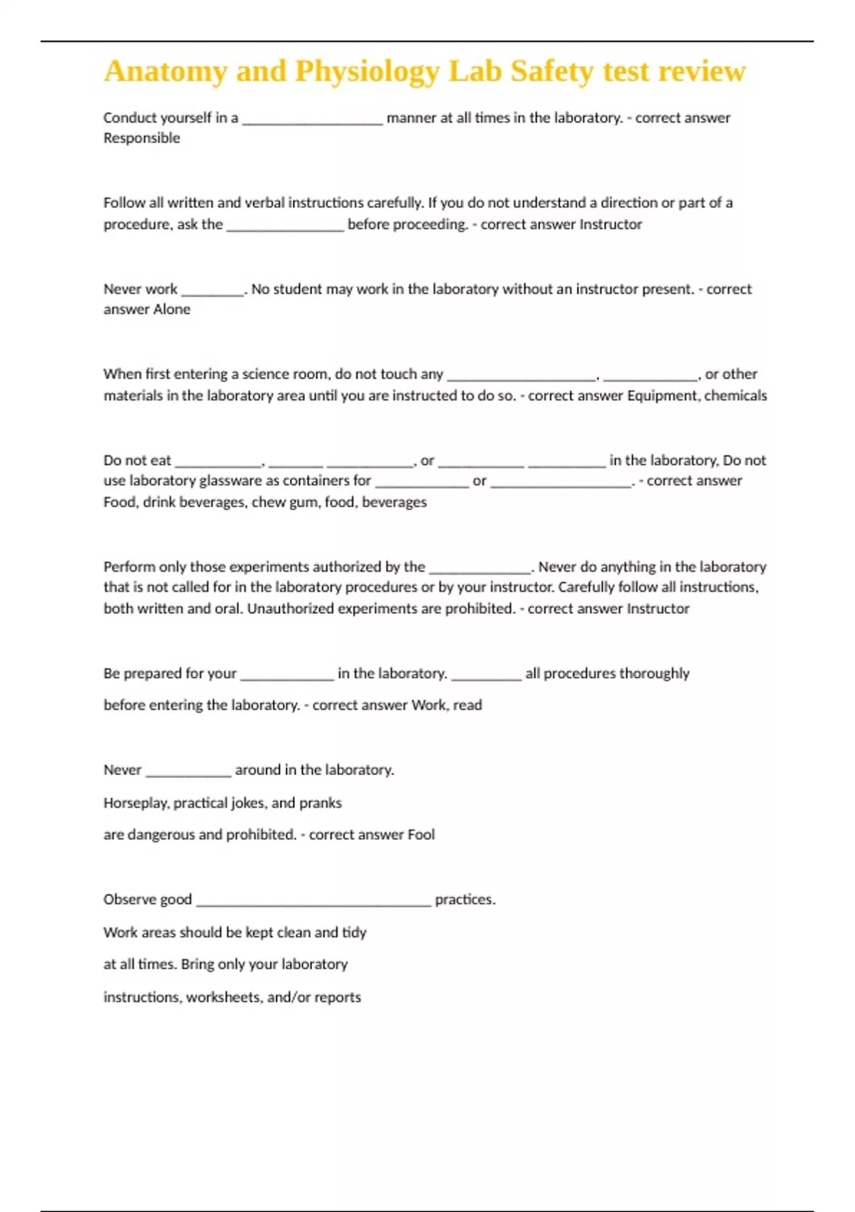 Conduct yourself in a __________________ manner at all times in the laboratory. - correct answer Responsible Follow all written and verbal instructions carefully. If you do not understand a direction or part of a procedure, ask the _______________ before proceeding. - correct answer Instructor Never work ________. No student may work in the laboratory without an instructor present. - correct answer Alone When first entering a science room, do not touch any ___________________, ____________, or other materials in the laboratory area until you are instructed to do so. - correct answer Equipment, chemicals Do not eat ___________, _______ ___________, or ___________ __________ in the laboratory, Do not use laboratory glassware as containers for ____________ or __________________. - correct answer Food, drink beverages, chew gum, food, beverages Perform only those experiments authorized by the _____________. Never do anything in the laboratory that is not called for in the laboratory procedures or by your instructor. Carefully follow all instructions, both written and oral. Unauthorized experiments are prohibited. - correct answer Instructor Be prepared for your ____________ in the laboratory. _________ all procedures thoroughly before entering the laboratory. - correct answer Work, read Never ___________ around in the laboratory. Horseplay, practical jokes, and pranks are dangerous and prohibited. - correct answer Fool Observe good ______________________________ practices. Work areas should be kept clean and tidy at all times. Bring only your laboratory instructions, worksheets, and/or reports