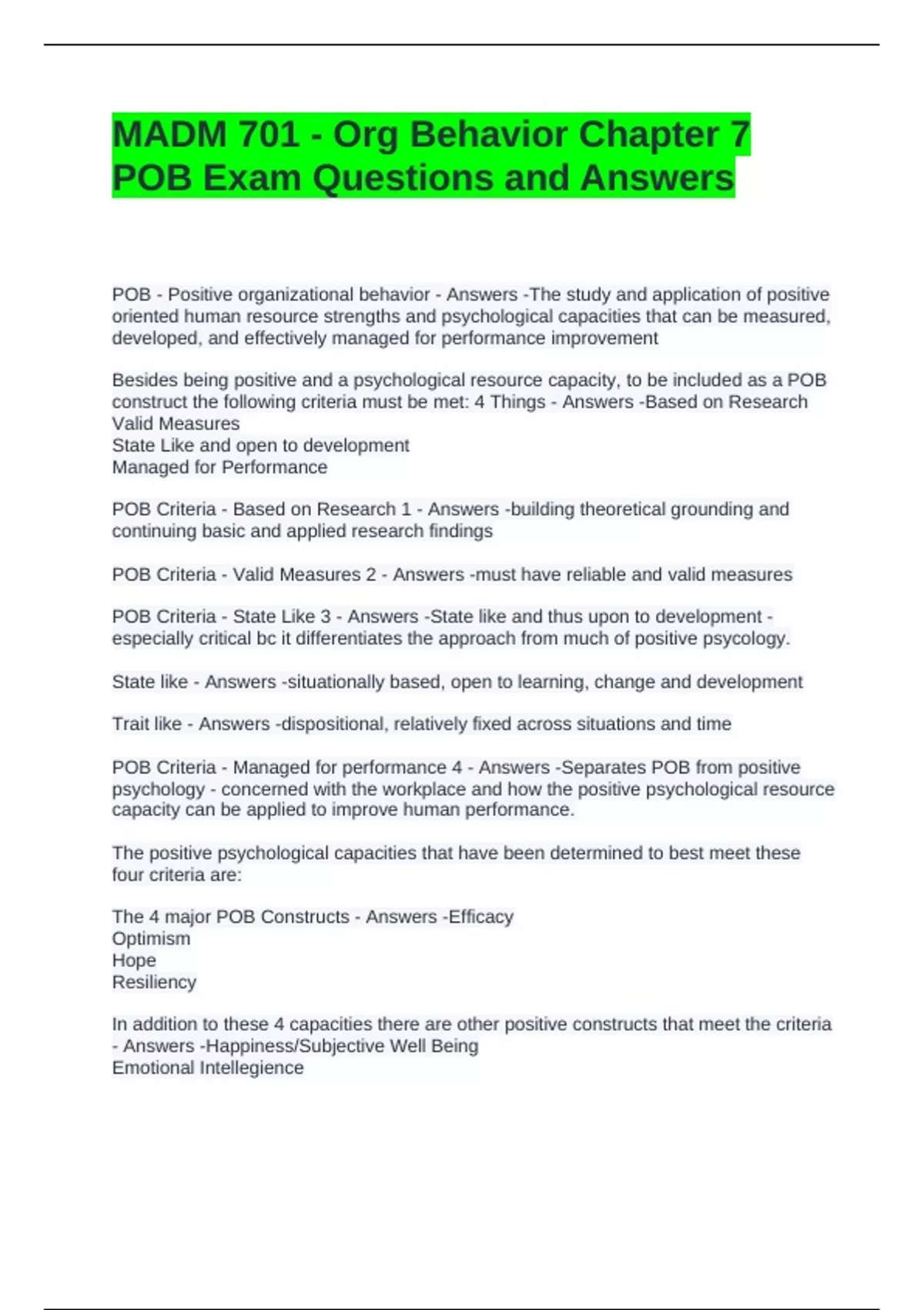 POB - Positive organizational behavior - Answers -The study and application of positive