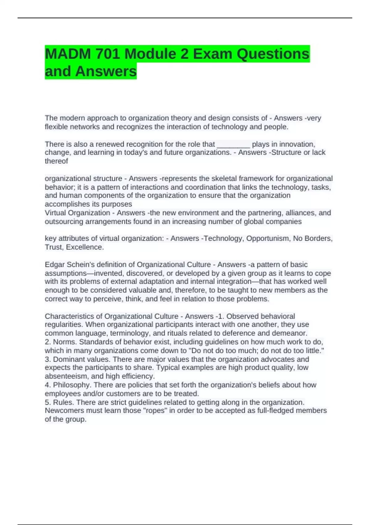 Characteristics of Organizational Culture - Answers -1. Observed behavioral