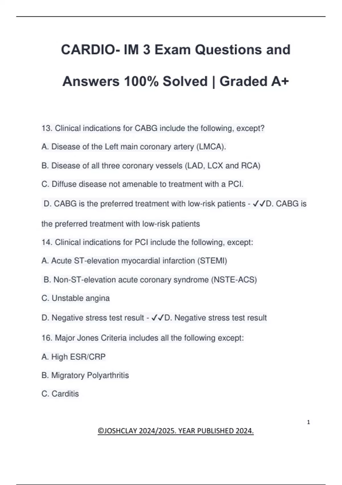 CARDIO- IM 3 Exam Questions and Answers 100% Solved | Graded A+ 13. Clinical indications for CABG include the following, except? A. Disease of the Left main coronary artery (LMCA). B. Disease of all three coronary vessels (LAD, LCX and RCA) C. Diffuse disease not amenable to treatment with a PCI. D. CABG is the preferred treatment with low-risk patients - D. CABG is the preferred treatment with low-risk patients 14. Clinical indications for PCI include the following, except: A. Acute ST-elevation myocardial infarction (STEMI) B. Non-ST-elevation acute coronary syndrome (NSTE-ACS) C. Unstable angina D. Negative stress test result - D. Negative stress test result 16. Major Jones Criteria includes all the following except: A. High ESR/CRP B. Migratory Polyarthritis C. Carditis