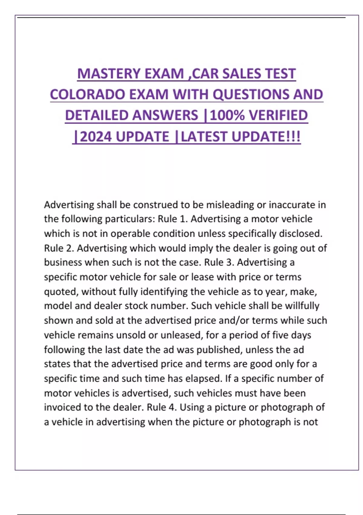 MASTERY EXAM ,CAR SALES TEST COLORADO EXAM WITH QUESTIONS AND DETAILED ANSWERS |100% VERIFIED |2024 UPDATE |LATEST UPDATE!!!