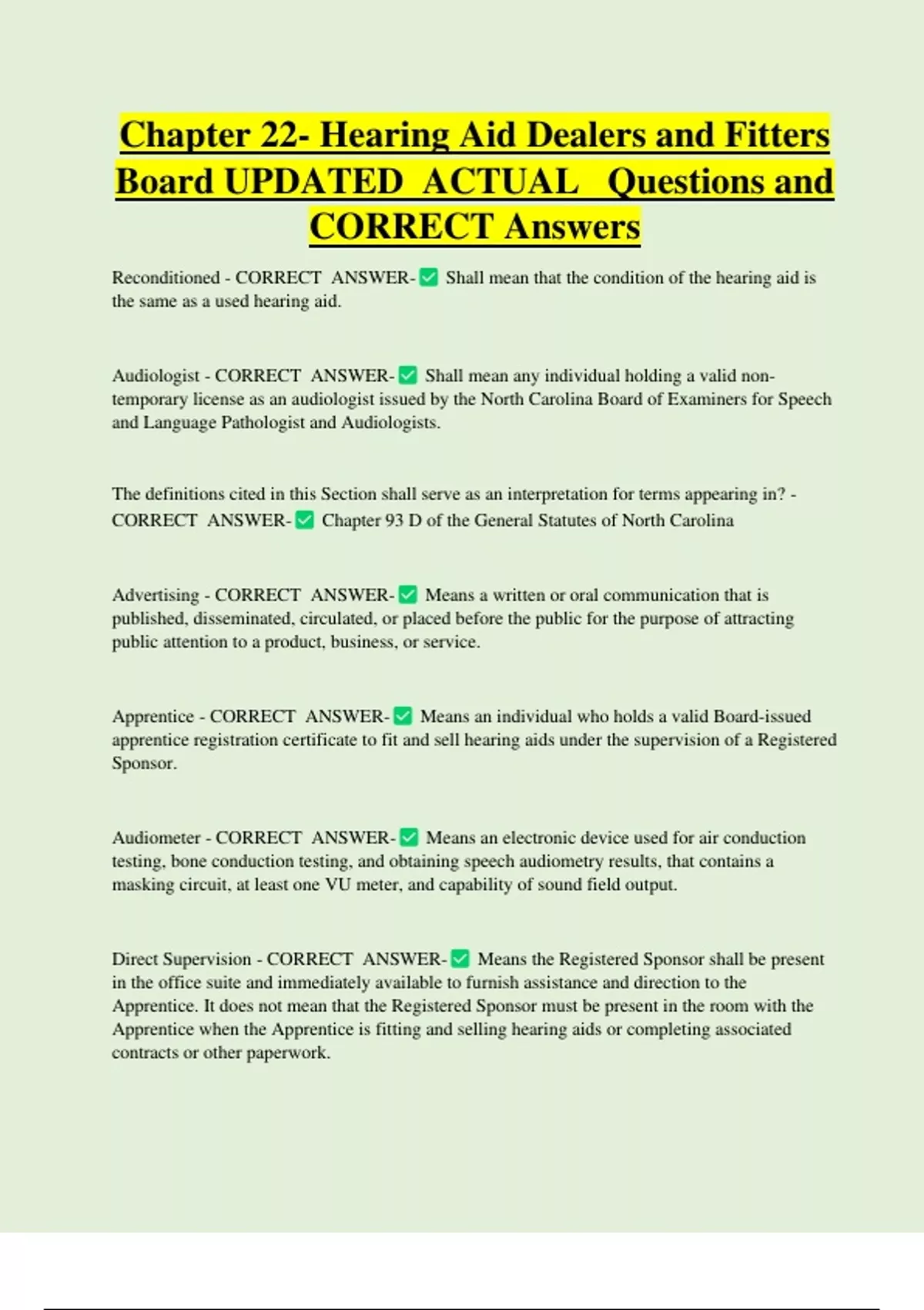 Chapter 22- Hearing Aid Dealers and Fitters Board UPDATED ACTUAL Questions and CORRECT Answers Reconditioned - CORRECT ANSWER- Shall mean that the condition of the hearing aid is the same as a used hearing aid. Audiologist - CORRECT ANSWER- Shall mean any individual holding a valid nontemporary license as an audiologist issued by the North Carolina Board of Examiners for Speech and Language Pathologist and Audiologists
